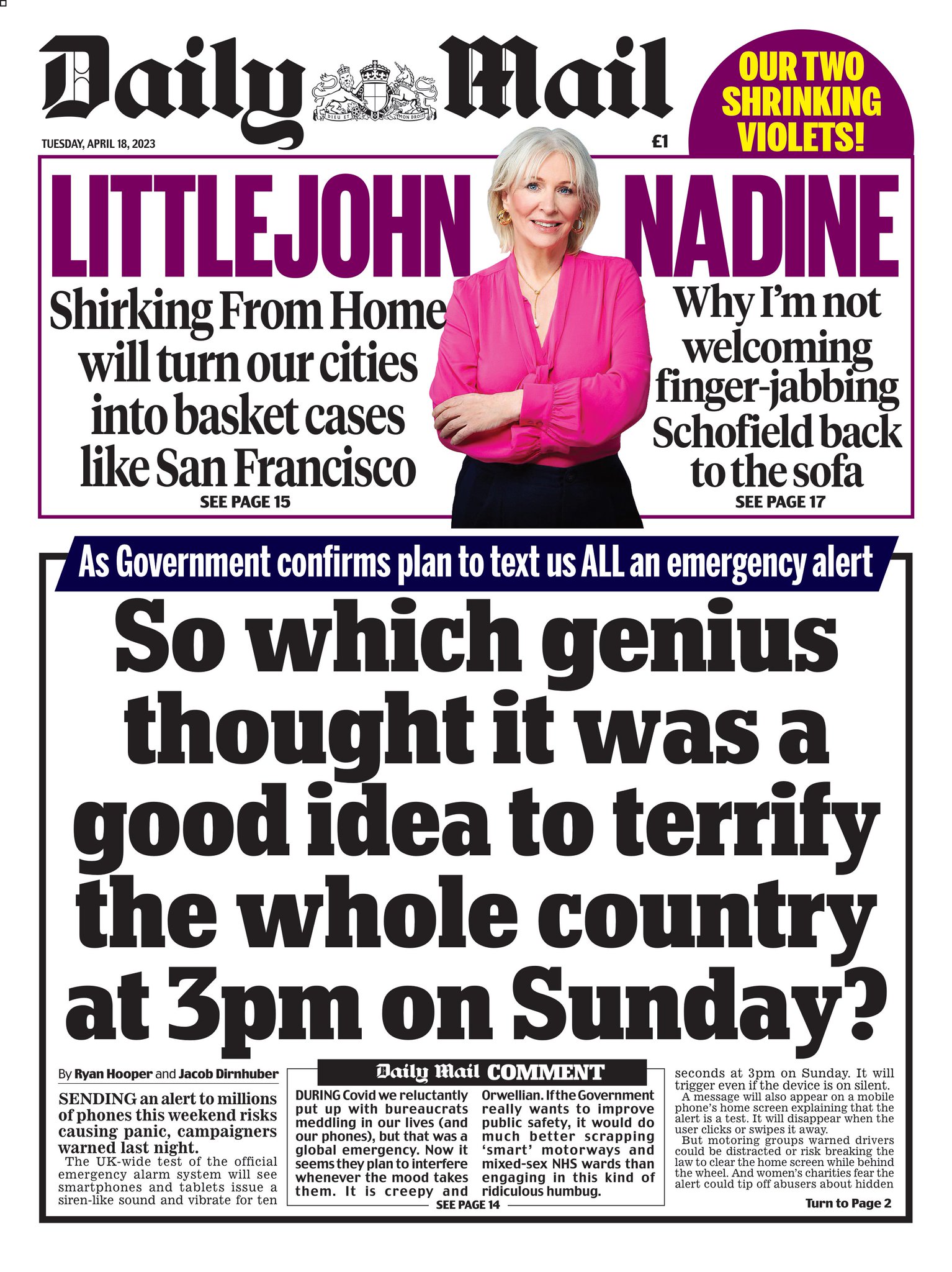 A UK-wide emergency alarm test is reported on by the Daily Mail.