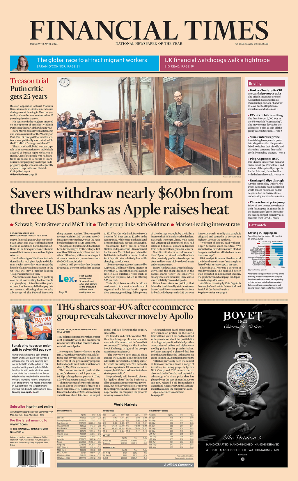 The Financial Times reports that three big US financial groups experienced bank deposit outflows of almost $60 billion in the first quarter.