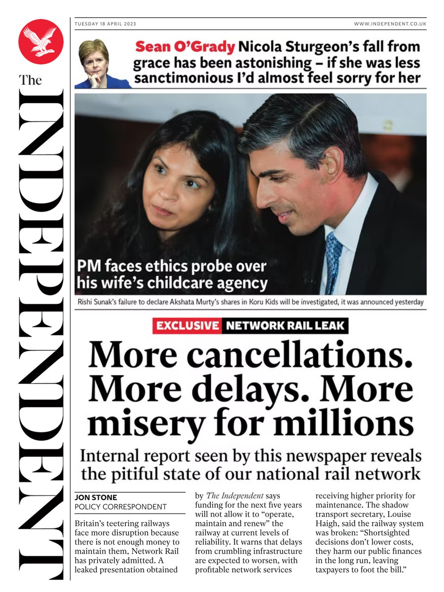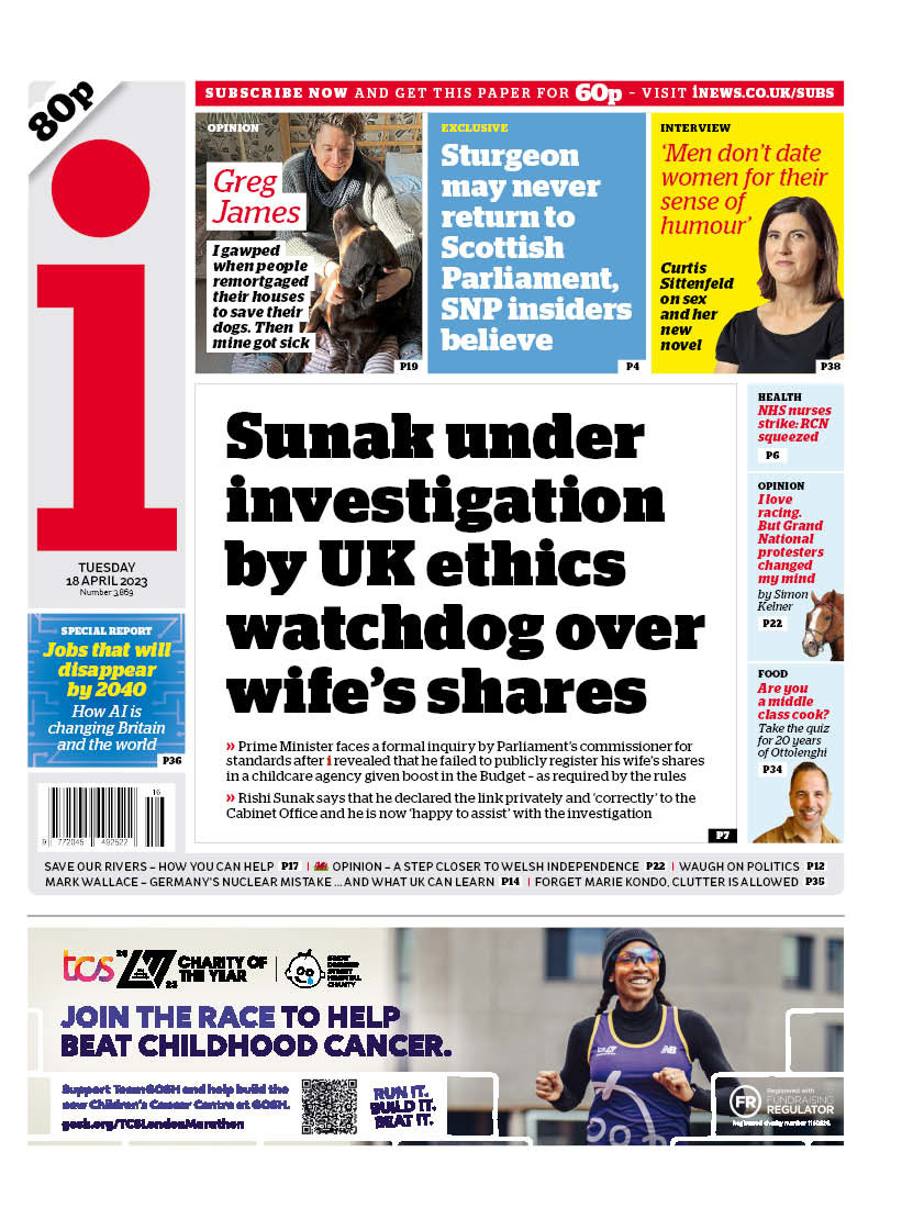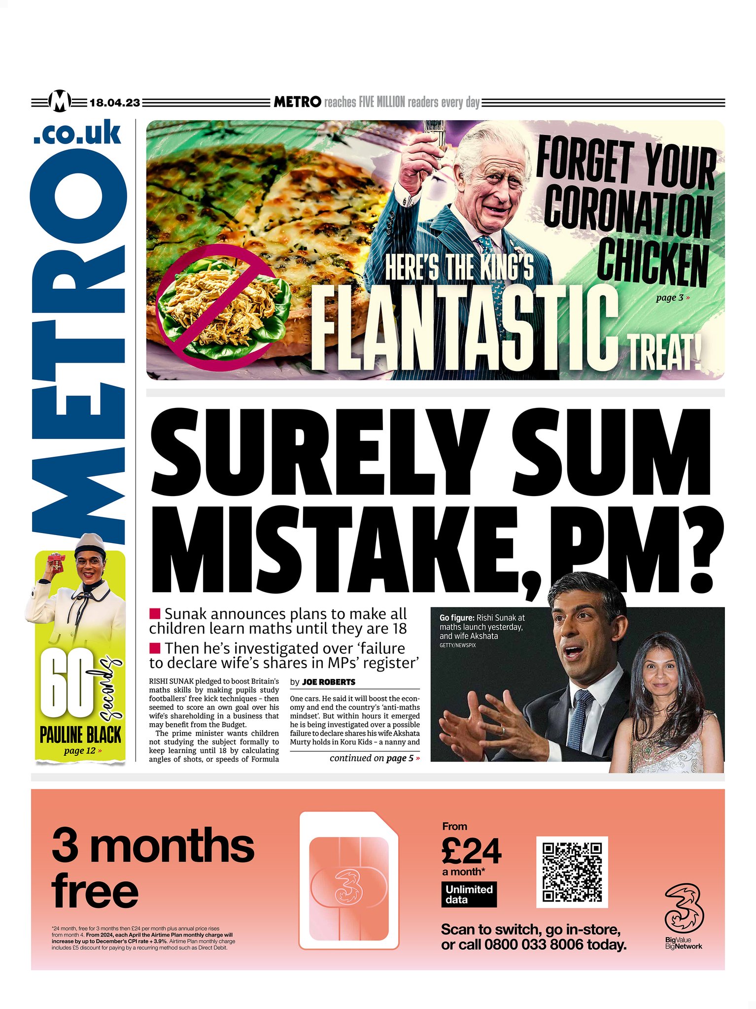 The Metro covers the PM promising to improve Britain’s math skills. It also highlights Rishi Sunak’s alleged failure to disclose his wife’s business dealings.