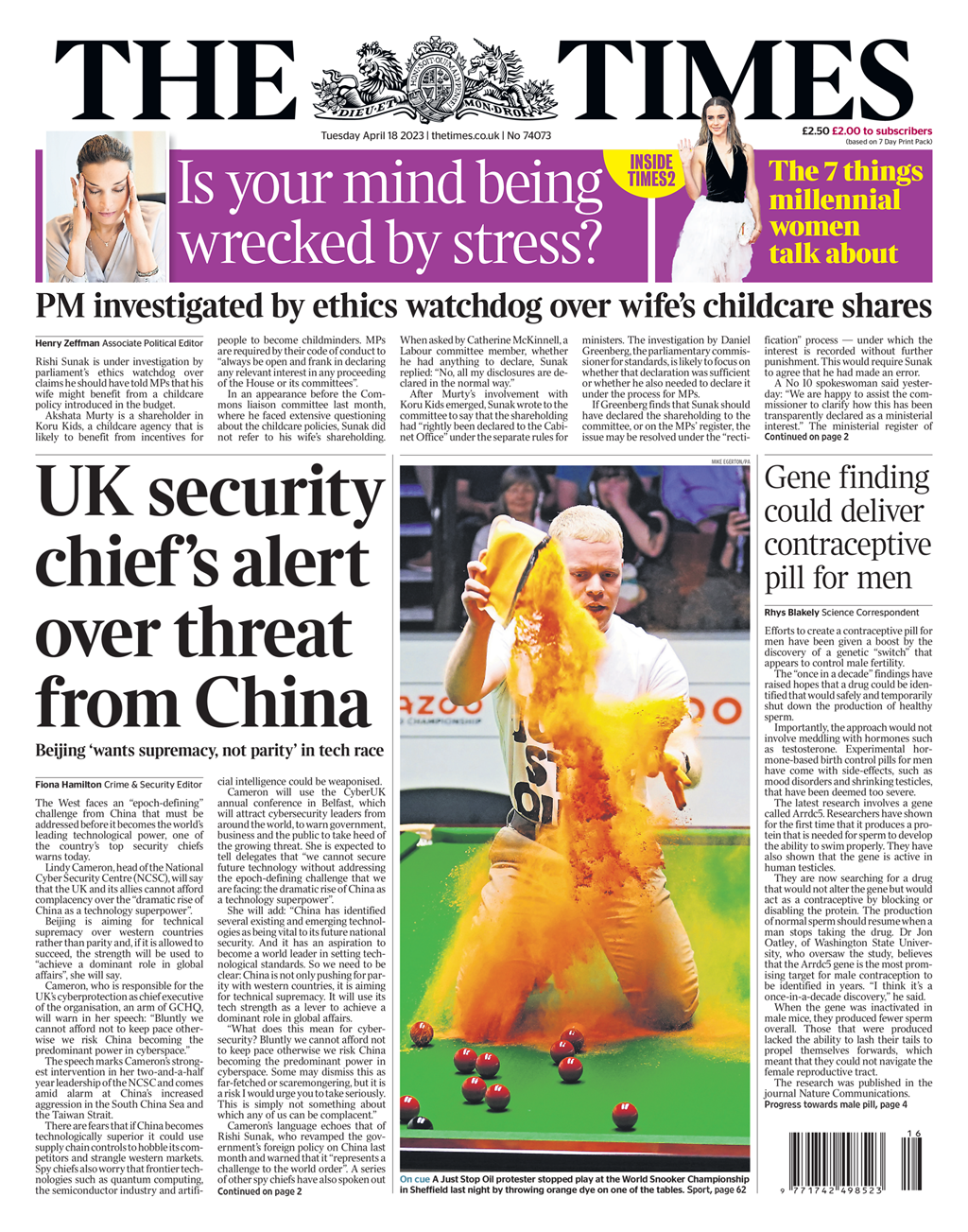 A UK security chief warns of a “epoch-defining” challenge from China in the Times.