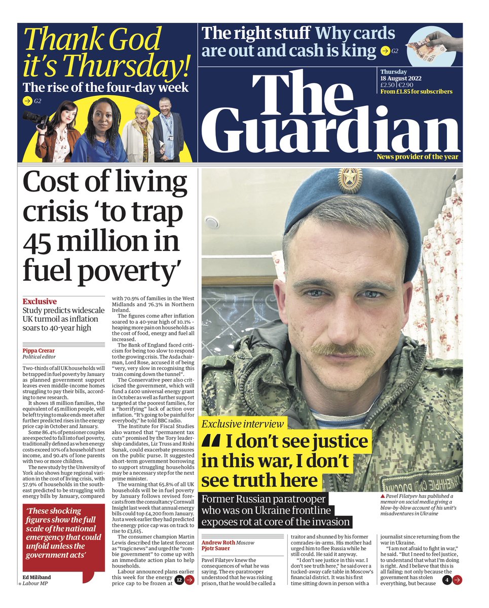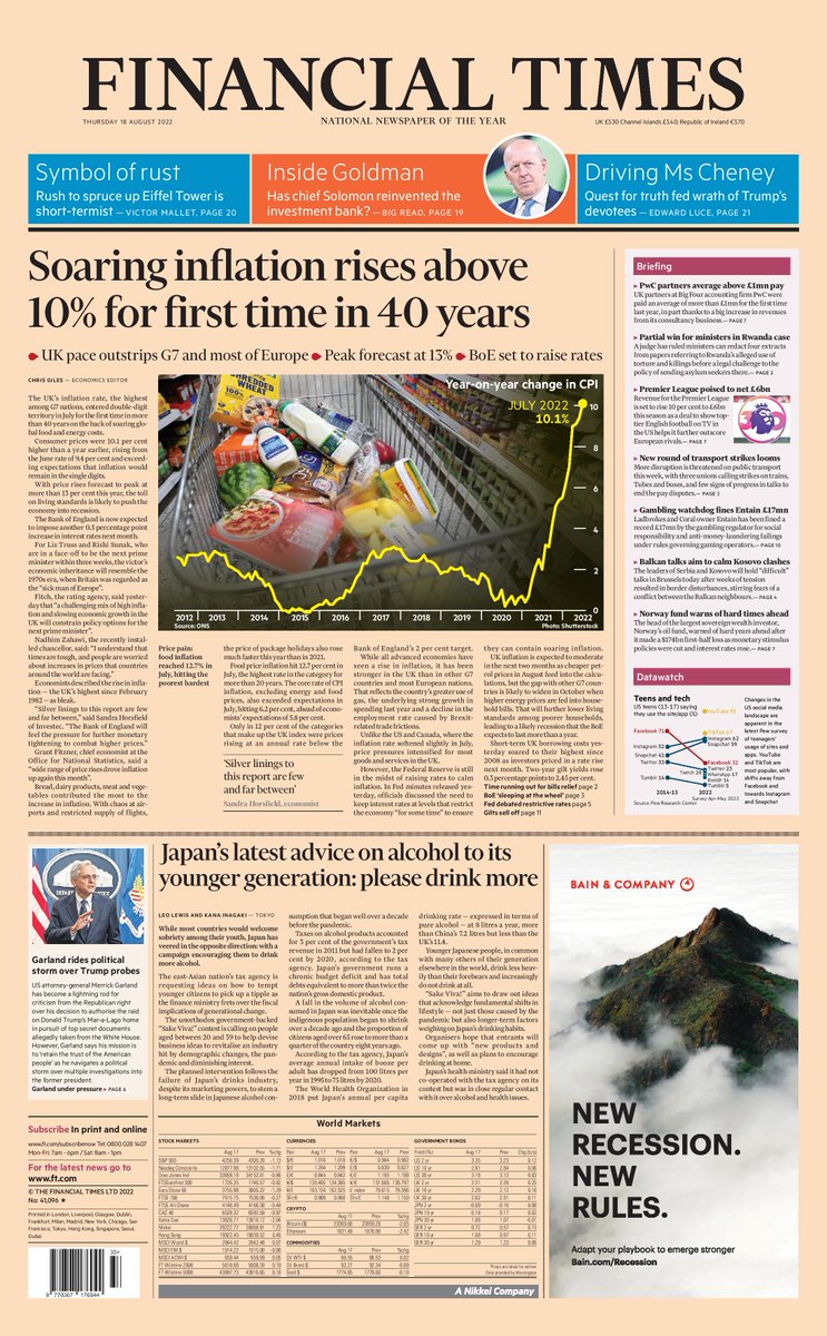 Financial Times reports that UK inflation hit double-digits in July for the first time in over 40 years as food and energy costs soar.