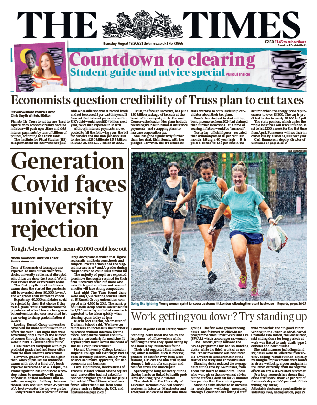 It is expected that tens of thousands of teenagers will miss out on their first choice universities as school leavers receive their exam results, according to The Times.