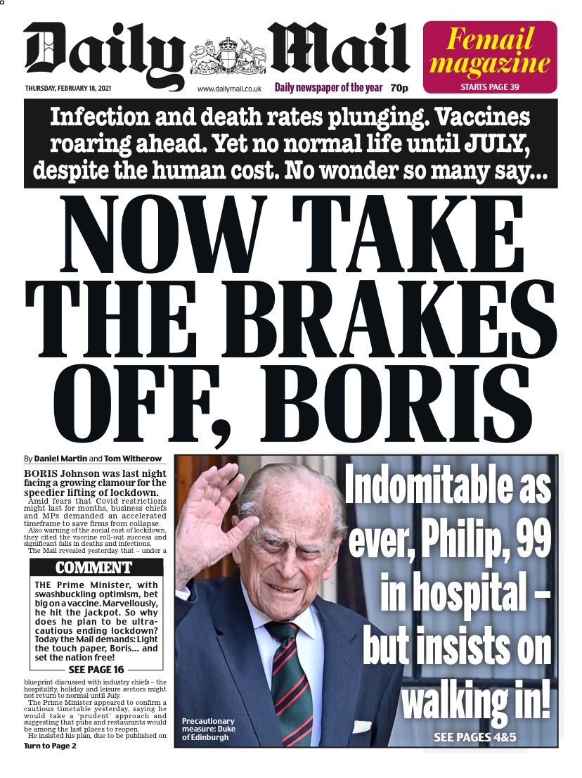 The Daily Mail leads on its calls for lockdown to be eased sooner rather than later, amid claims some hospitality venues may not reopen until July.”Light the touch paper, Boris… and set the nation free!” it says.