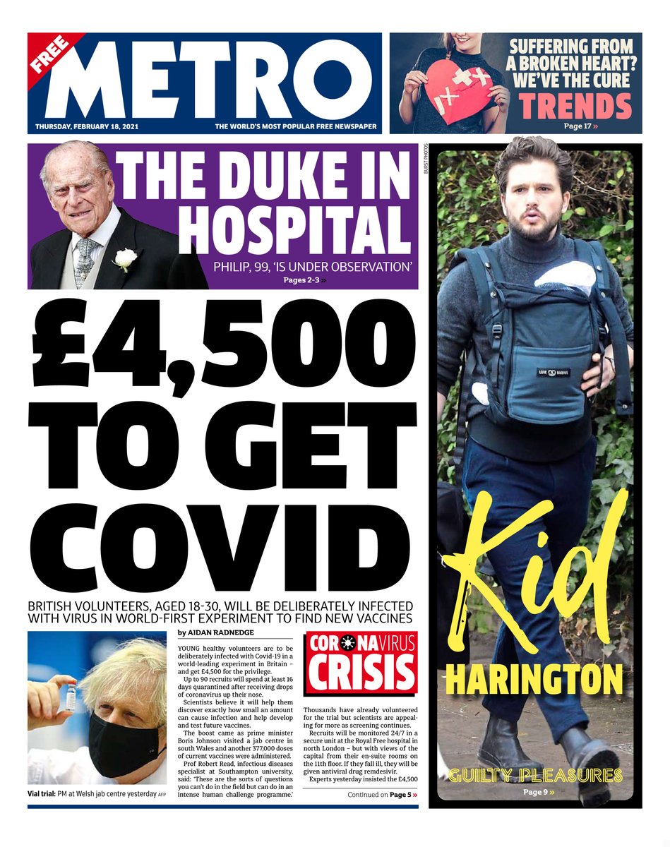 Metro leads on calls for 18 to 30-year-olds in the UK to volunteer to be infected with coronavirus as part of a new scientific study.Participants will be paid £4,500, the paper reports.You can read more here.
