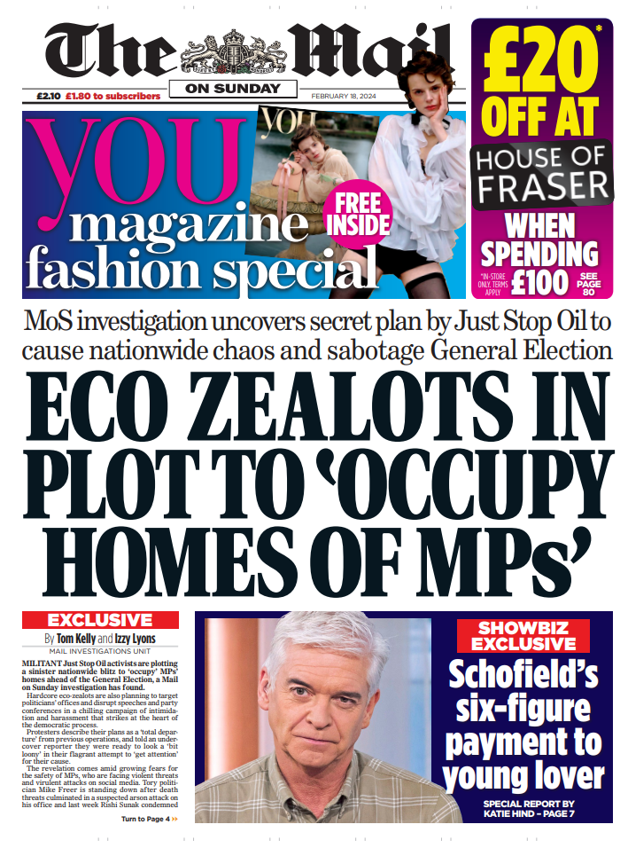 The Mail on Sunday reveals plans by Just Stop Oil activists to stage protests at MPs’ residences and interrupt party conferences.