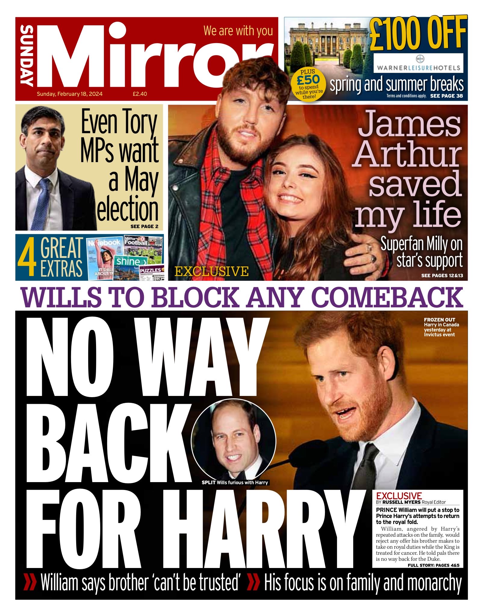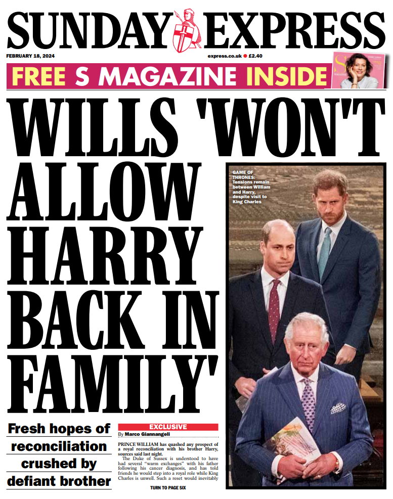 The Sunday Express reports Prince William’s firm stance on his brother’s possible resumption of frontline royal duties.