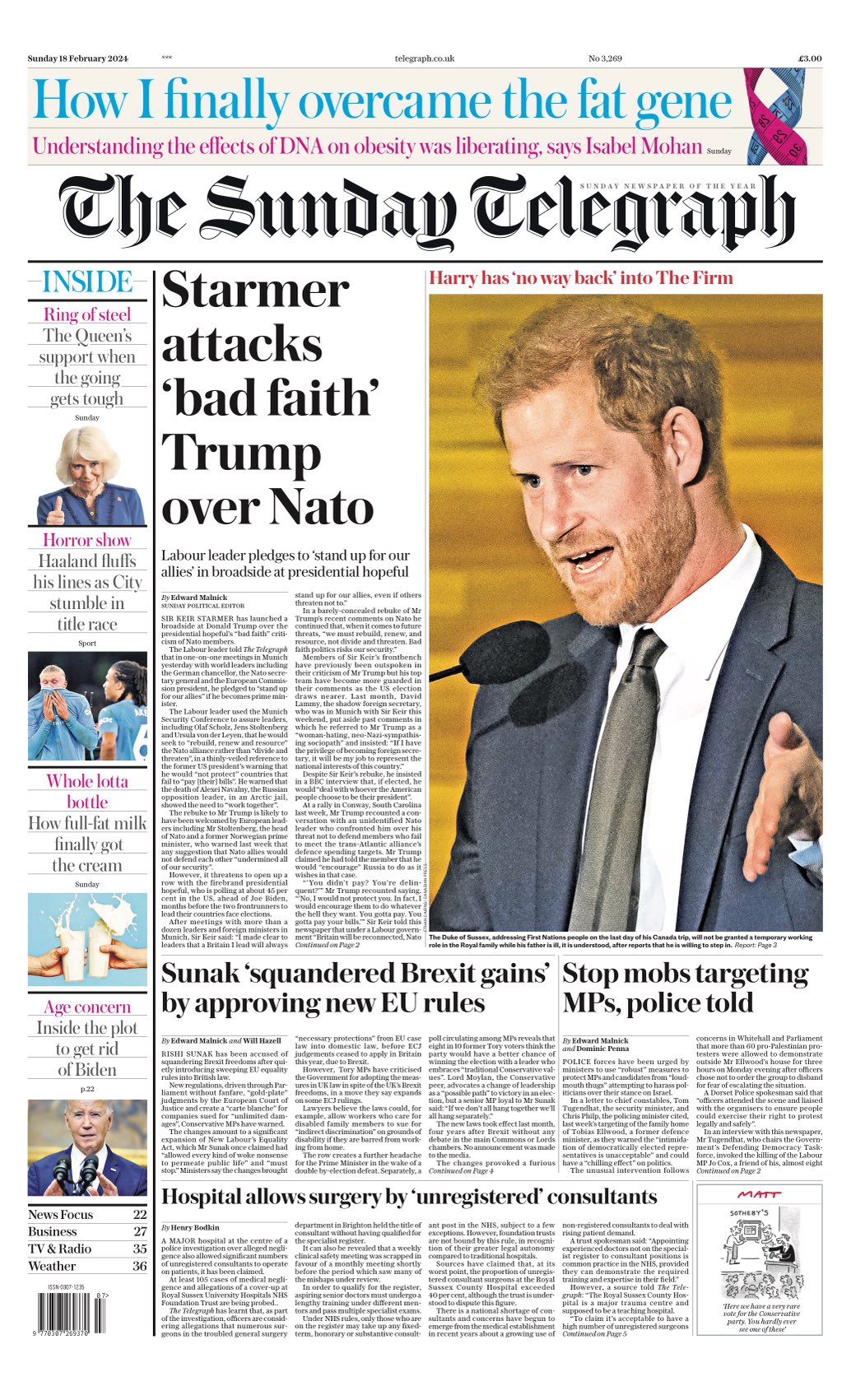 The Sunday Telegraph highlights Sir Keir Starmer’s warning about the security risks of bad faith politics, seemingly aimed at Donald Trump.