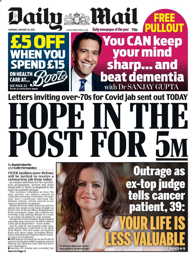Hope in the post for five million people, the Daily Mail reports, with letters to be sent on Monday inviting the next two priority groups to get the coronavirus vaccine.