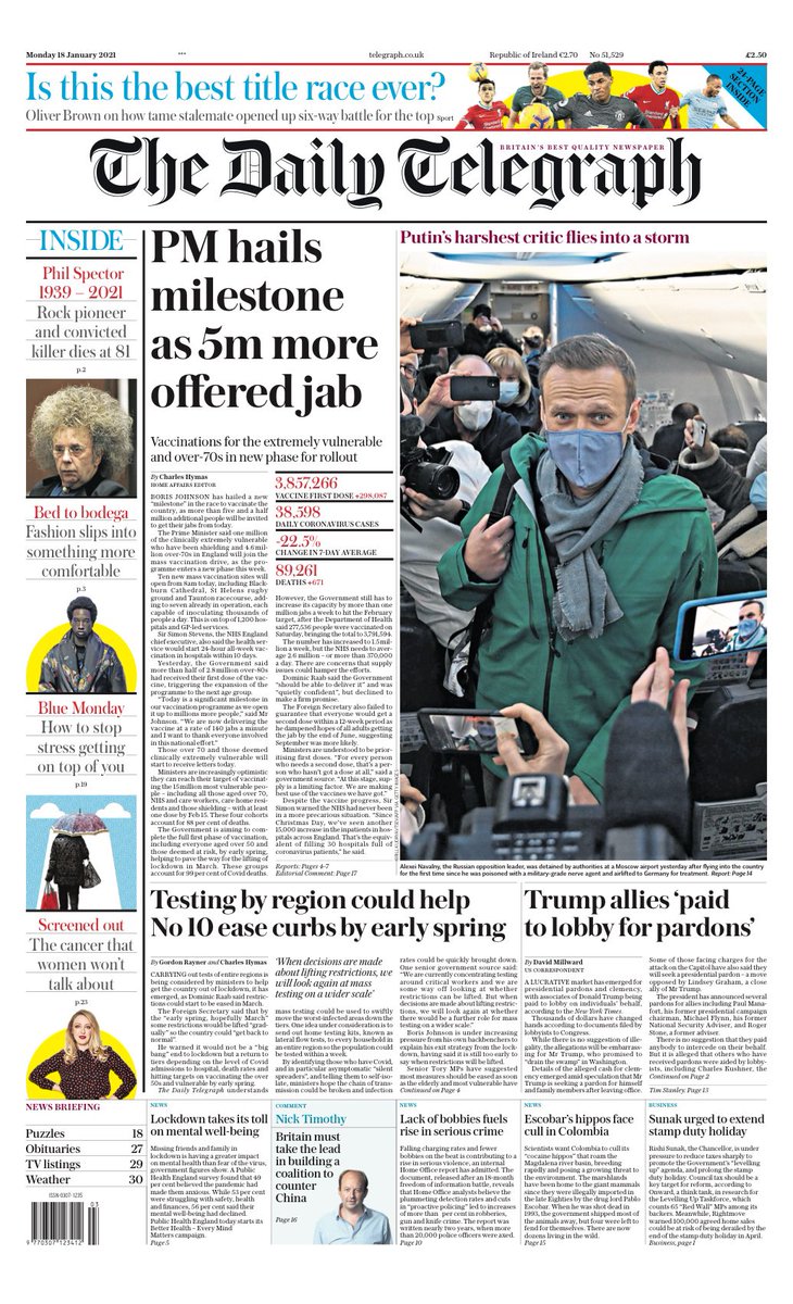 The Times says it’s full speed ahead with the vaccination of the over-70s, as they and the clinically extremely vulnerable are set to be called up for the coronavirus vaccine from this week. Our story is here.