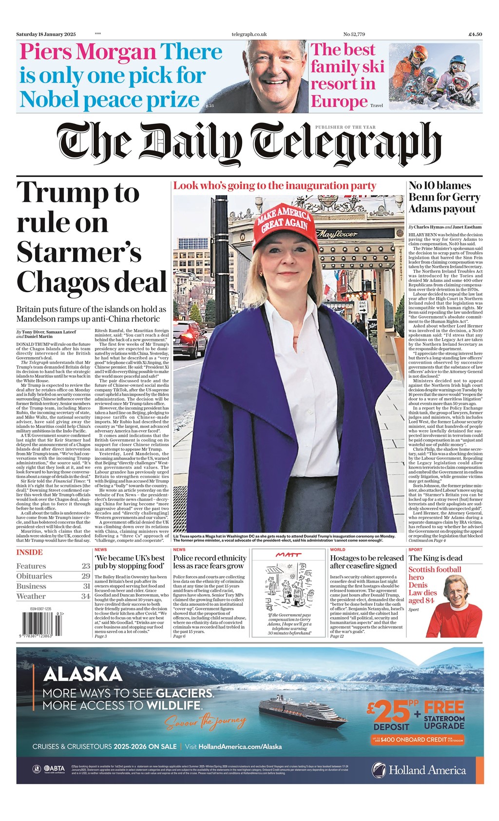 Donald Trump will make a decision regarding the Chagos Islands agreement involving the UK, as Britain temporarily halts the deal amid increasing anti-China rhetoric from Peter Mandelson.