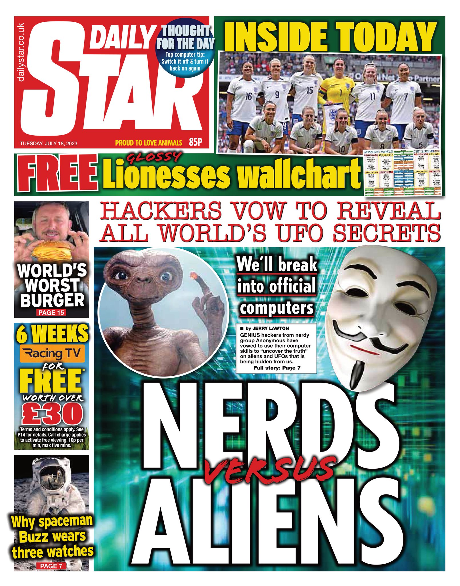 The Daily Star headlines that Anonymous, the hacking collective, has vowed to reveal government-secrets about UFOs and aliens.