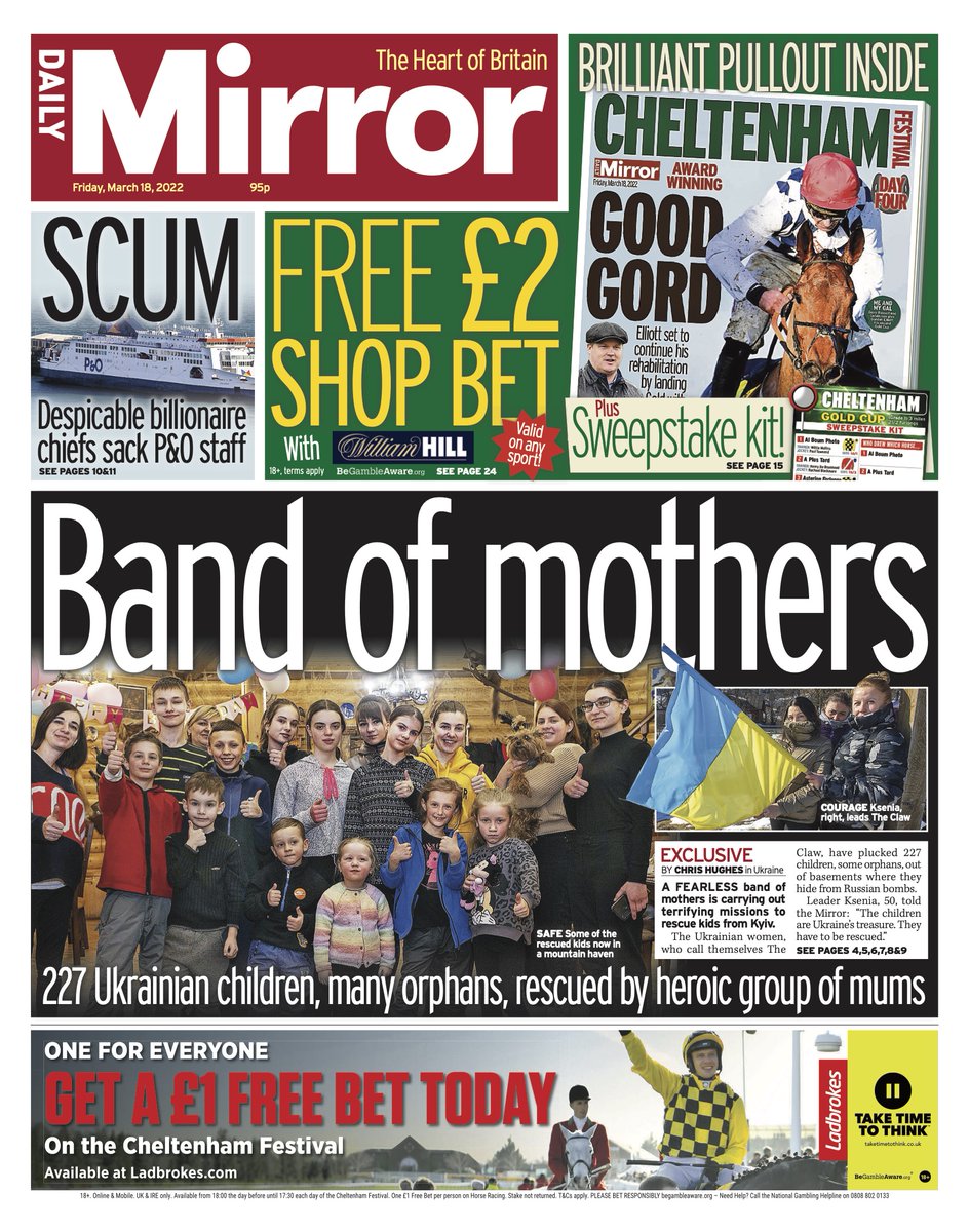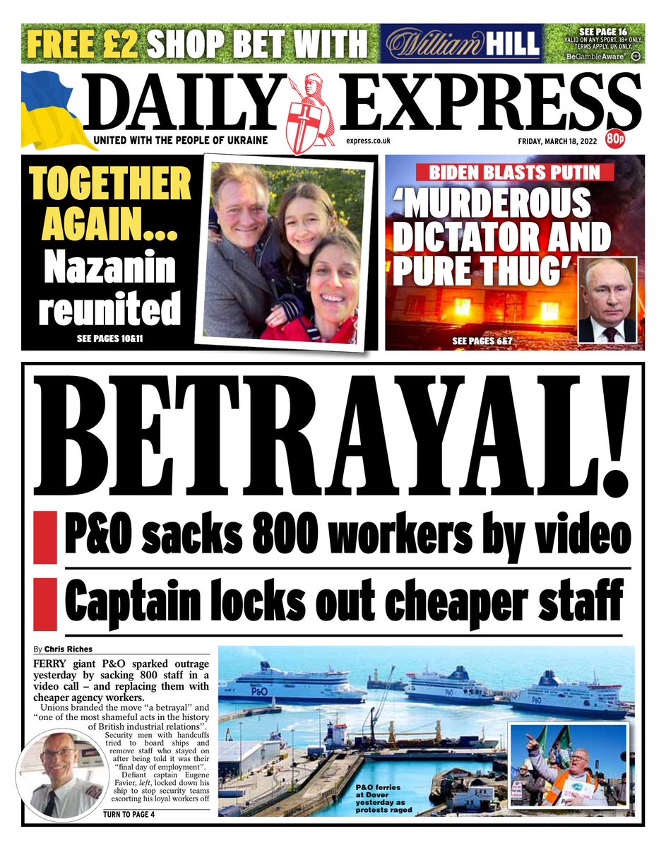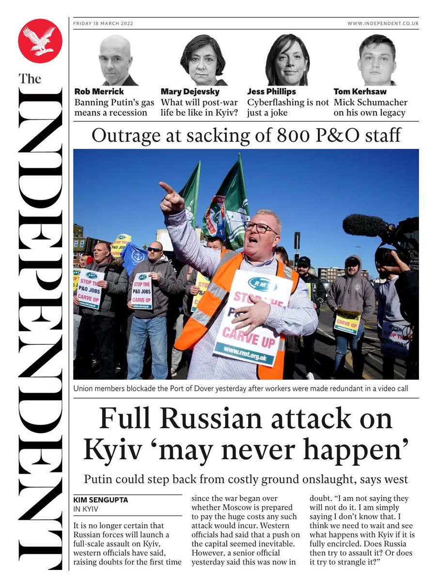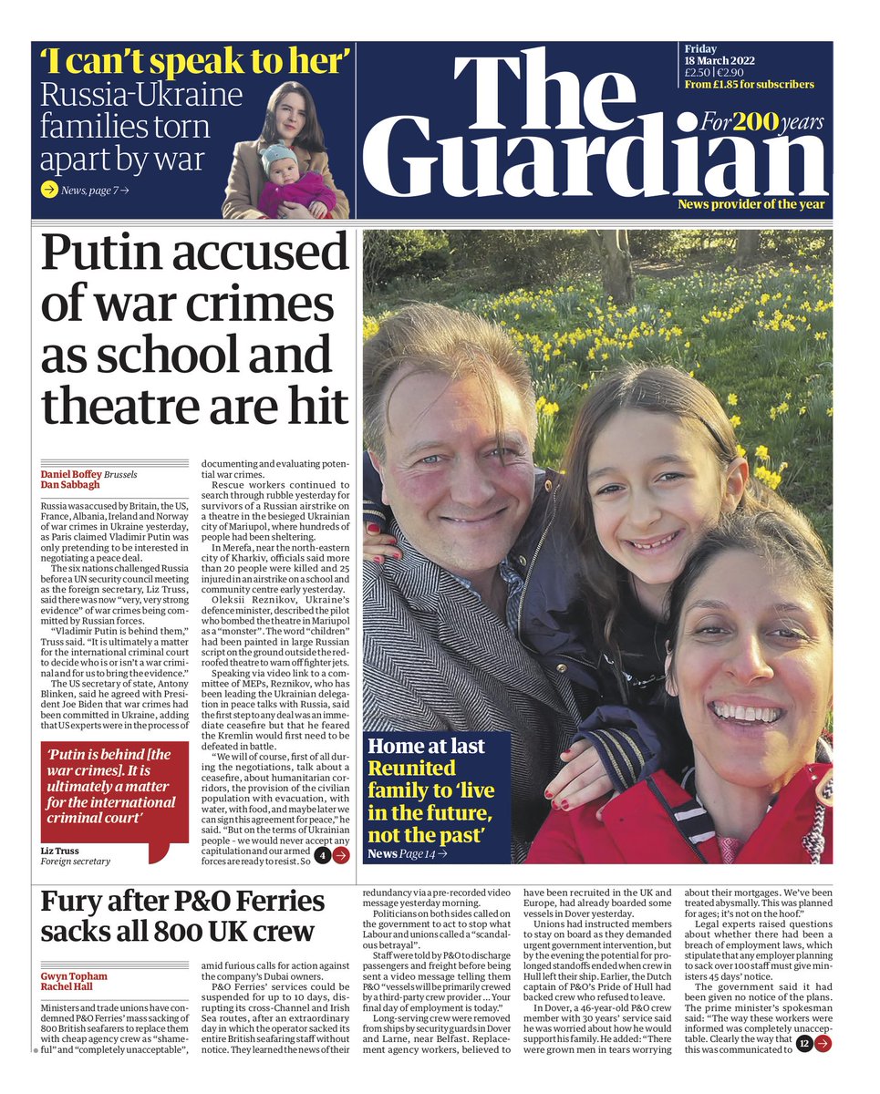 Russia has been accused by the UK, US, France Albania, Ireland and Norway of war crimes in Ukraine, the Guardian reports.The paper also claimed France believes Russian President Vladimir Putin is online pretending to be interested in negotiating a peace deal. The front page also shares a heart-warming family picture of Nazanin Zaghari-Ratcliffe being reunited with her husband Richard and daughter Gabriella.