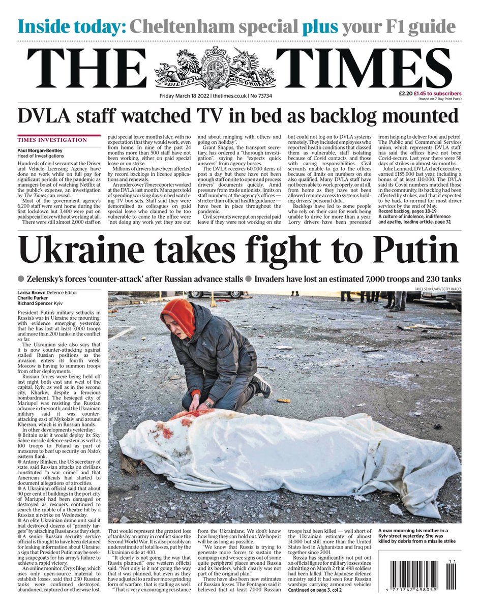 An investigation by the Times has found hundreds of civil servants at the DVLA have done no work while on full pay for long periods of the pandemic while managers boasted of watching Netflix at the public’s expense. Meanwhile, Putin is facing more setbacks after evidence emerged yesterday that he has lost at least 7,000 troops and more than 200 tanks in the conflict in Ukraine so far.