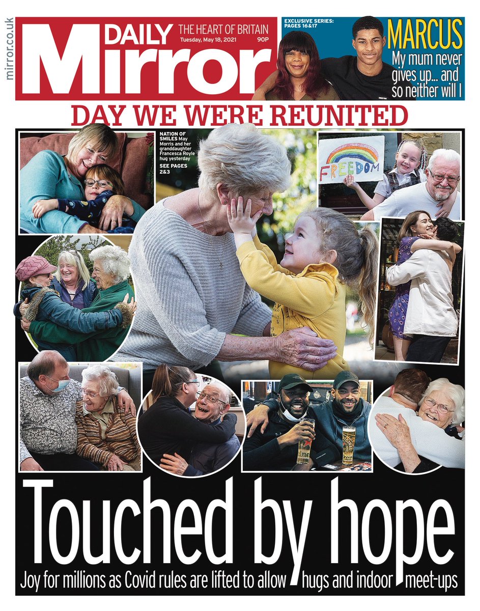 The Daily Mirror pictures people reunited with a hug after Monday’s easing of COVID rules.