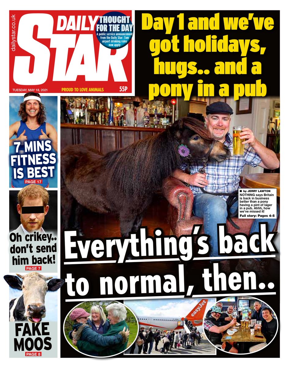 The Daily Star pictures a pony in a pub among other upbeat images of the easing of COVID restrictions.