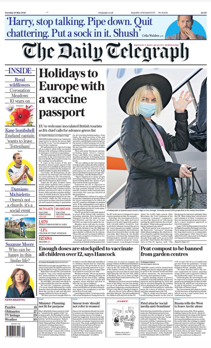 Britons are expected to get the green light from the EU to use “vaccine passports”, the Telegraph reports.It says fully vaccinated people would be able to fly to Europe without having a test or going through quarantine.