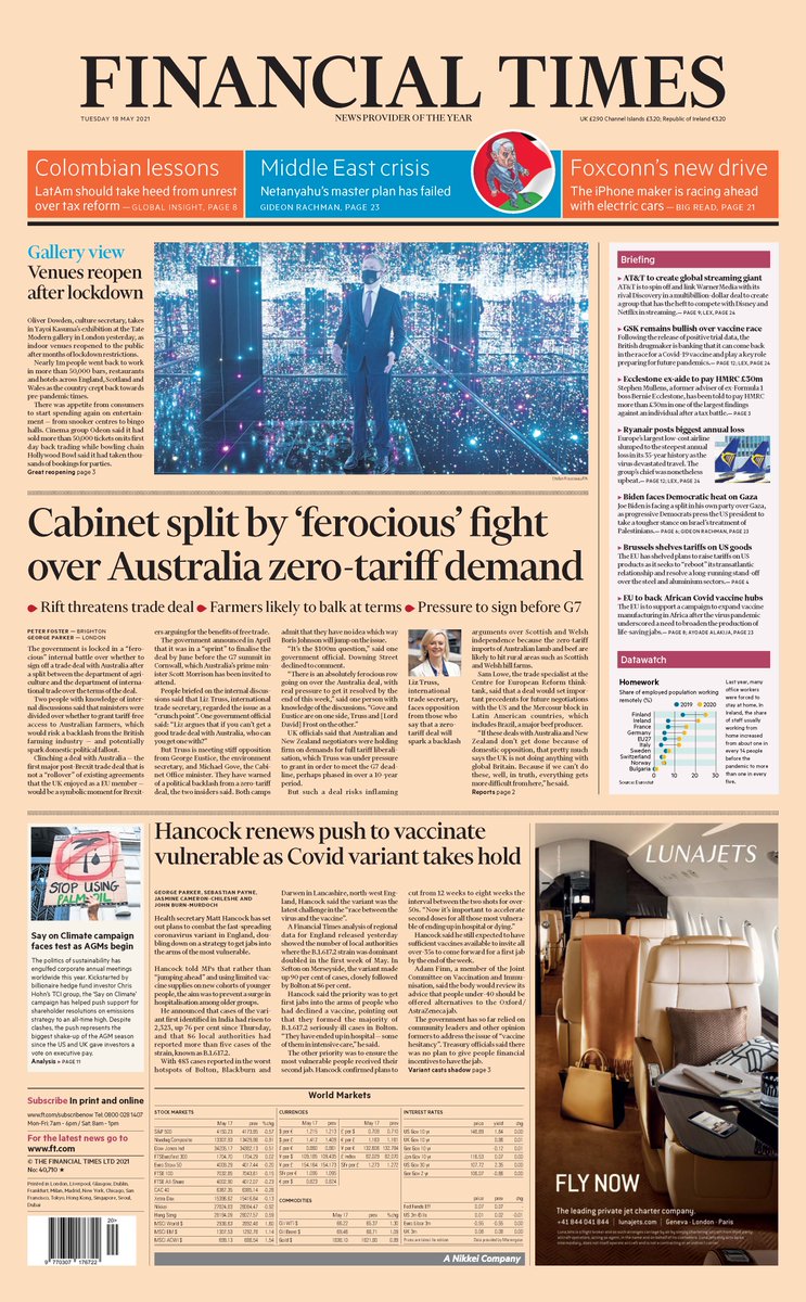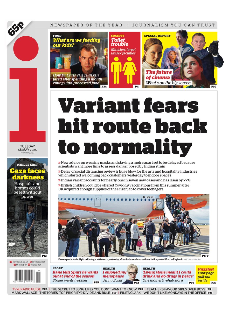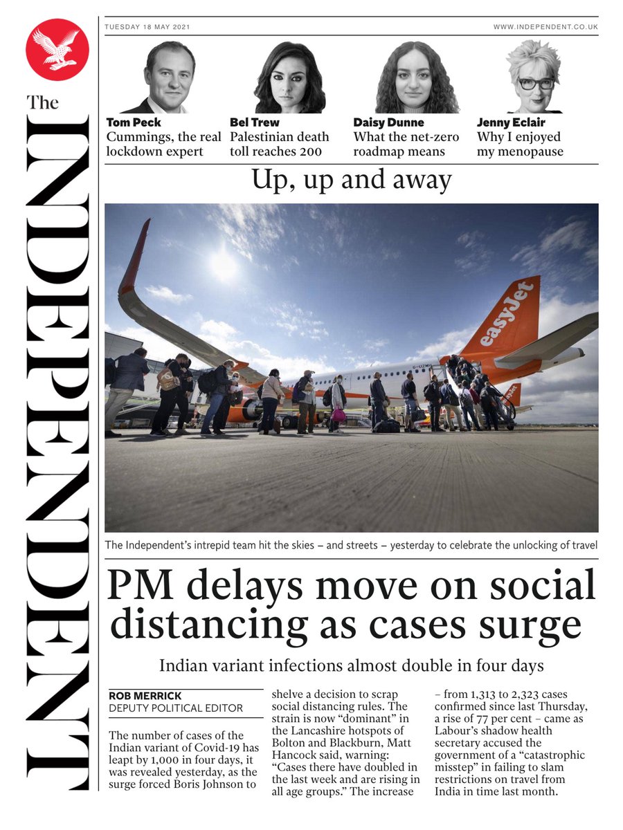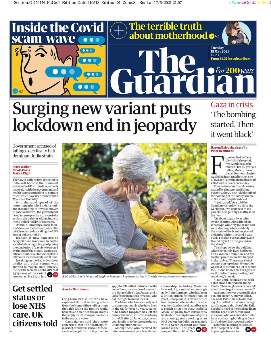 The Guardian leads with a warning from experts that the Indian coronavirus variant will become the dominant strain “within days”.It says the 21 June final step out of lockdown is in “significant doubt” because of the rise in cases.