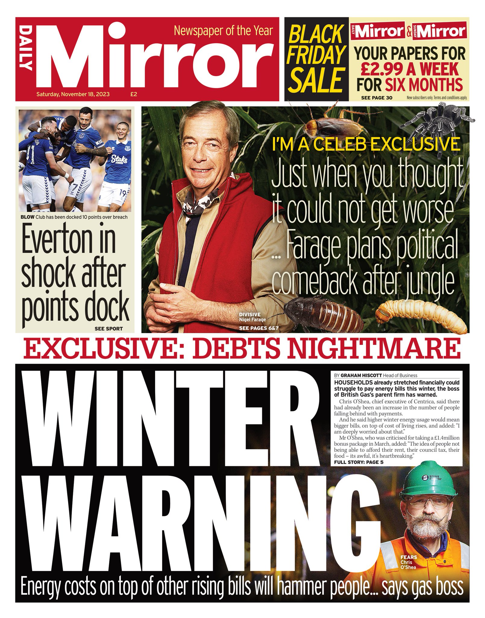 The Daily Mirror reports on the potential struggle for households to pay energy bills amidst the cost of living crisis.