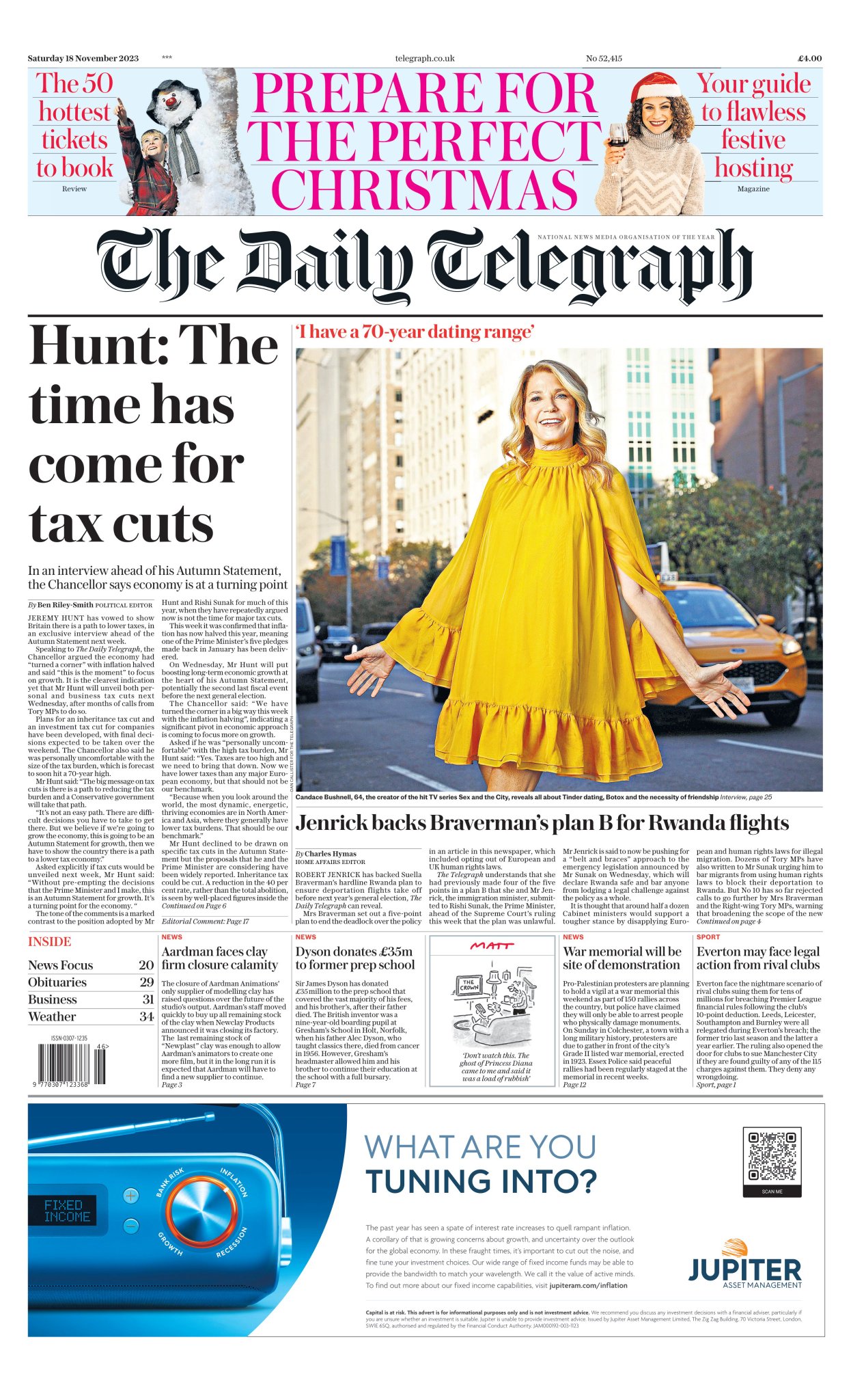 The Daily Telegraph features Chancellor Jeremy Hunt’s announcement of impending tax cuts.