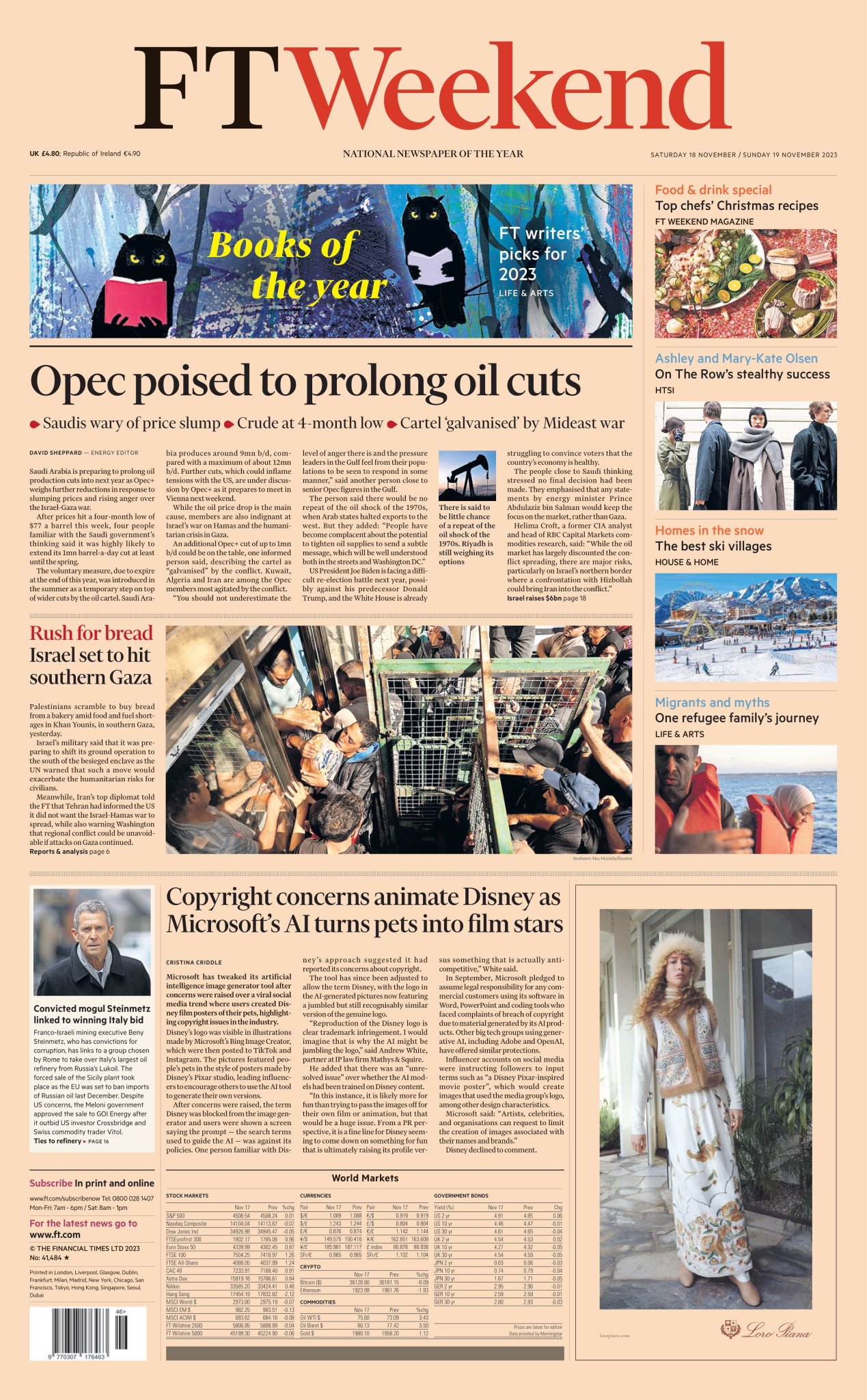 The Financial Times reports on Saudi Arabia’s plans to extend oil production cuts until 2024 due to falling prices.