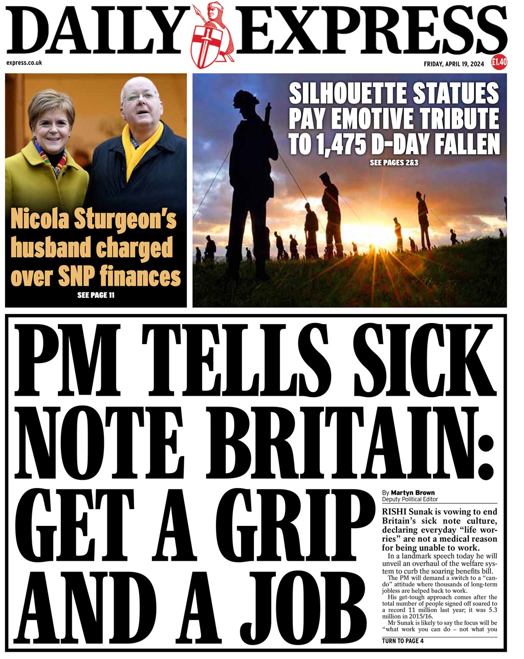 The Daily Express reports Rishi Sunak’s plans to abolish the ‘sick note culture’ and reduce the national welfare expenditure.