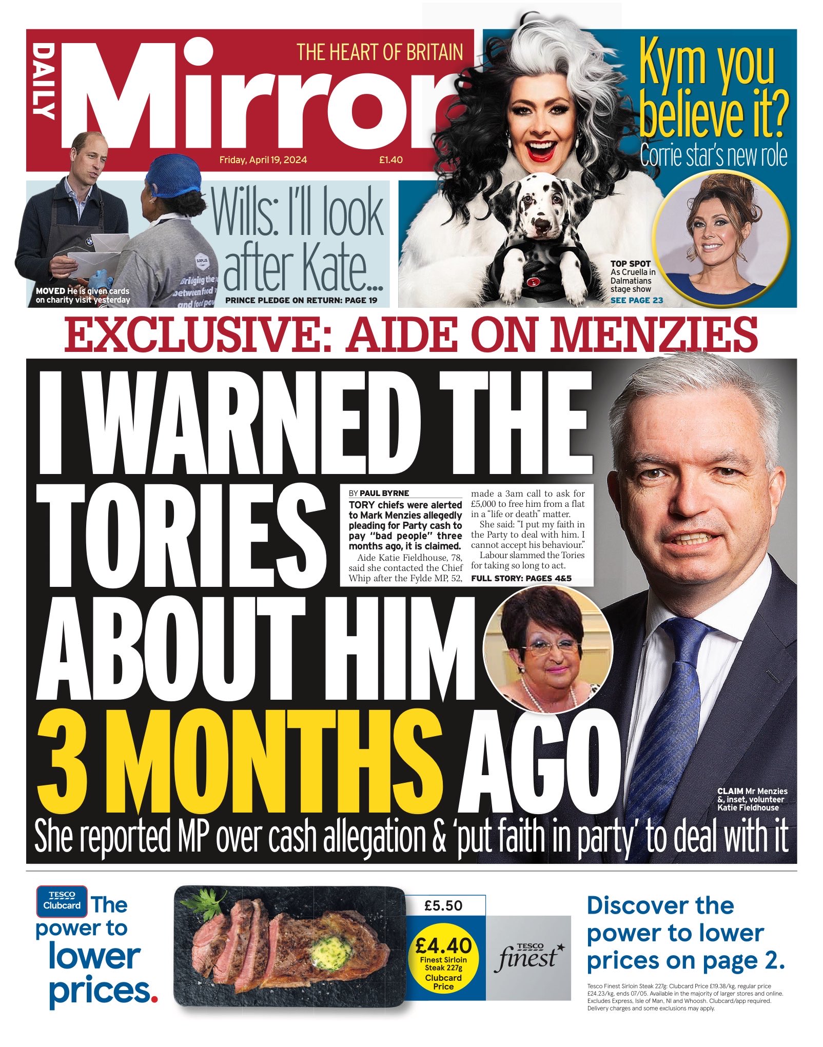 The Daily Mirror reports that Tory leaders were allegedly aware of accusations against MP Mark Menzies three months prior.