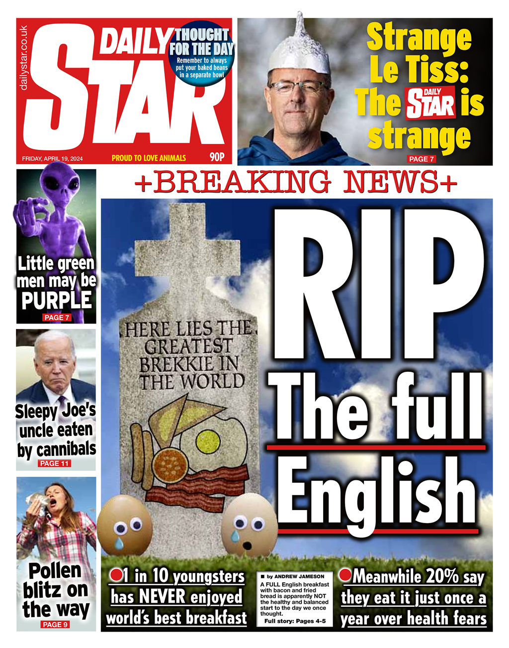 The Daily Star reports a decline in the popularity of the full English breakfast, with only 20% indulging annually.