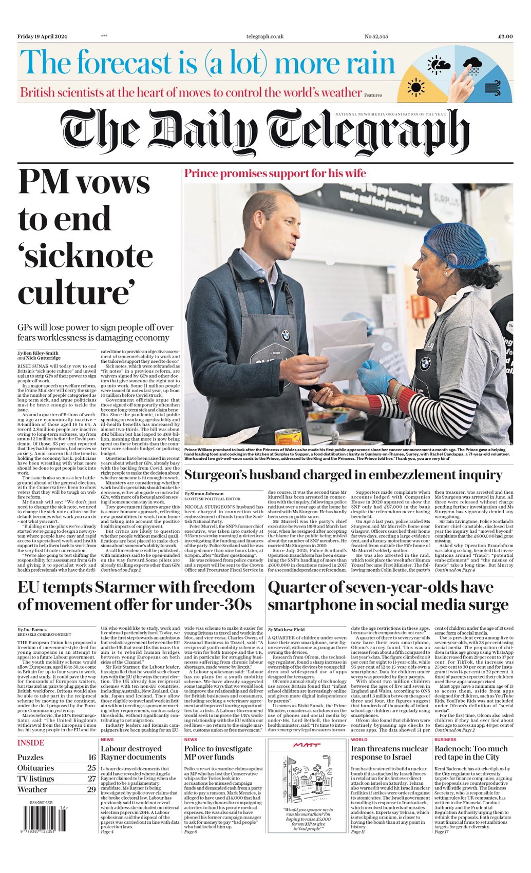 The Daily Telegraph reports on the prime minister’s pledge to halt the UK’s “sick note culture” by preventing GPs from signing people off work.
