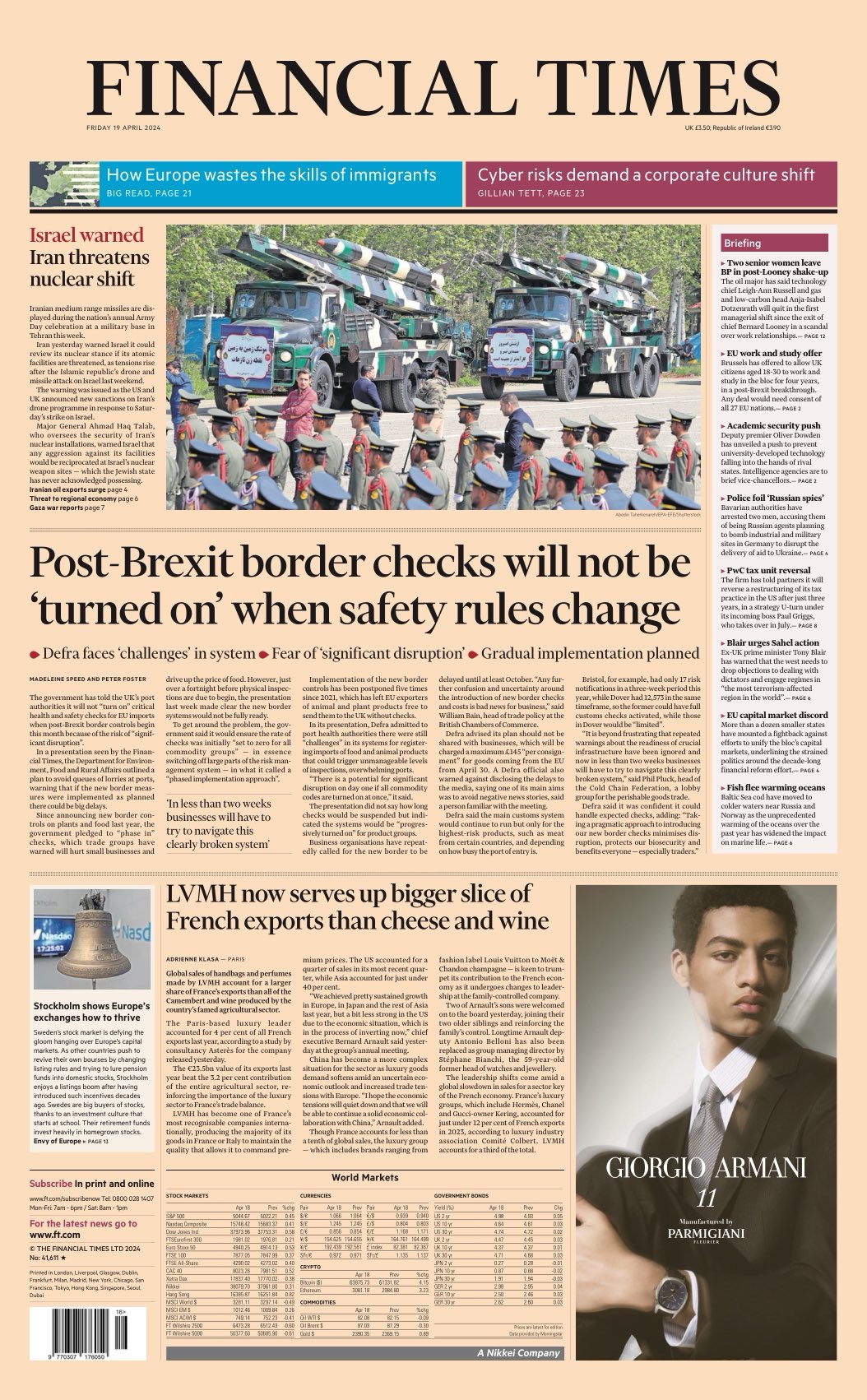 The Financial Times reports that the government will not activate crucial health and safety checks for EU imports due to possible major disruptions as post-Brexit border controls commence.