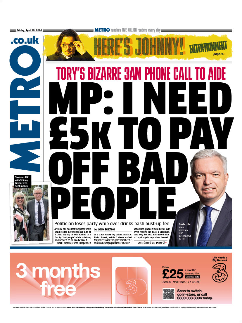 Metro newspaper investigates allegations against Tory MP Mark Menzies.
