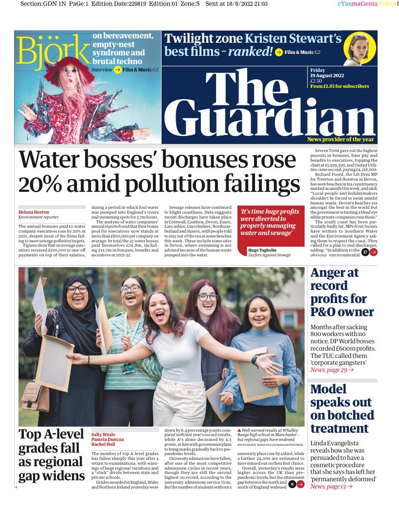 A 20% bonus hike for water bosses makes the front page of The Guardian, while their companies continue to discharge sewage into the ocean.