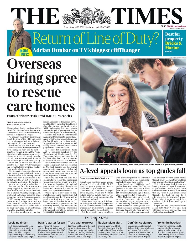 A winter crisis could force the hiring of thousands of overseas workers to fill the 160,000 vacancies in the care sector, reports The Times.