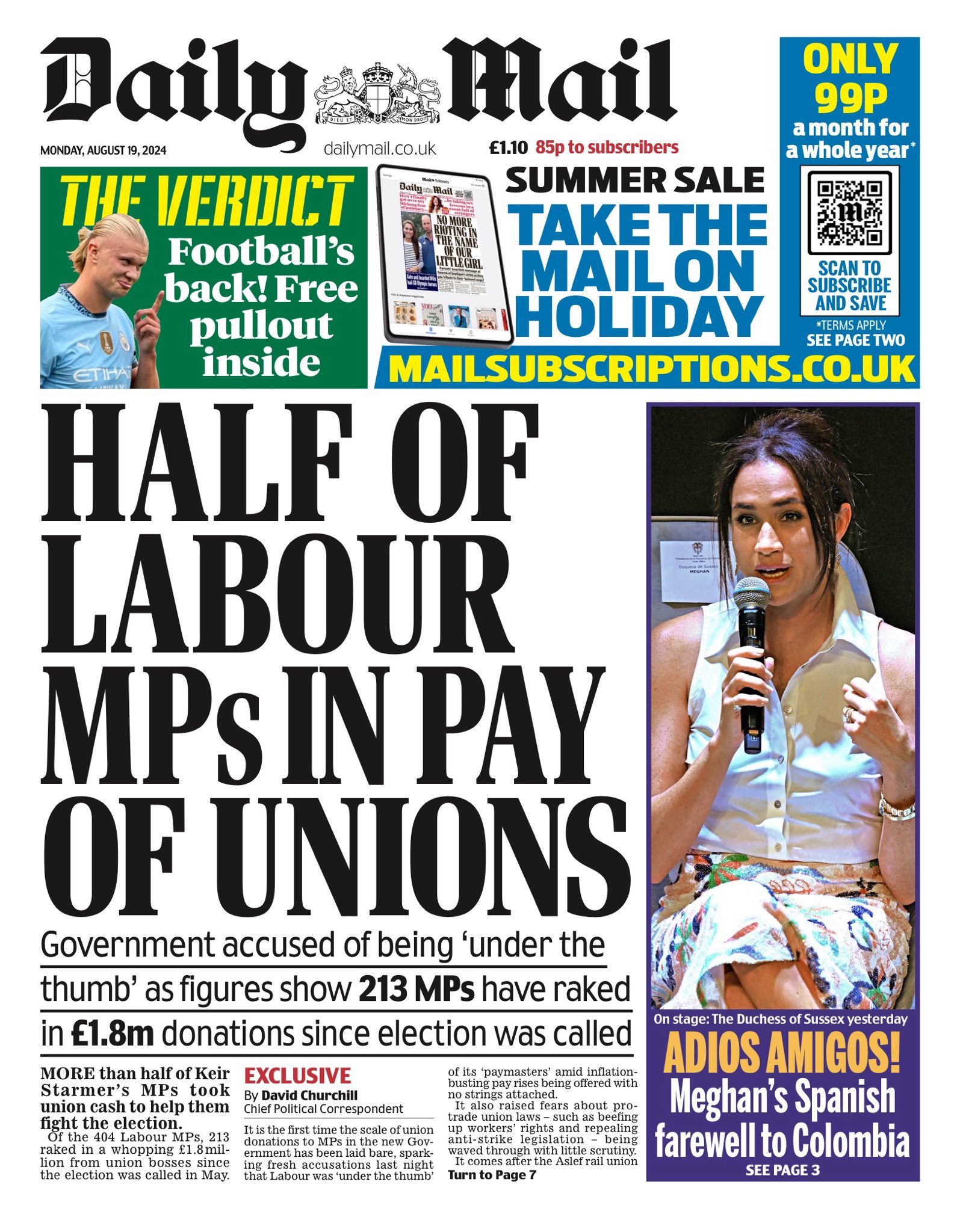 Daily Mail reveals that over half of Labour MPs have received union donations since the May election call.