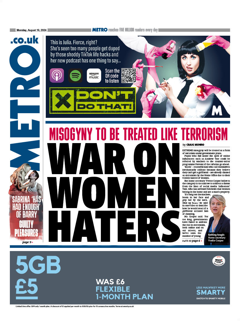 Extreme misogyny will be treated as a form of terrorism under new government plans, with officials suggesting that those who commit such acts could be subjected to similar interventions as other forms of extremist behaviour.