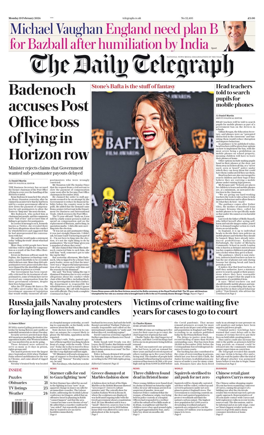 The Daily Telegraph reports on Business Secretary Kemi Badenoch’s accusation of deceit against the ex-chair of the Post Office over Horizon scandal compensation claims.