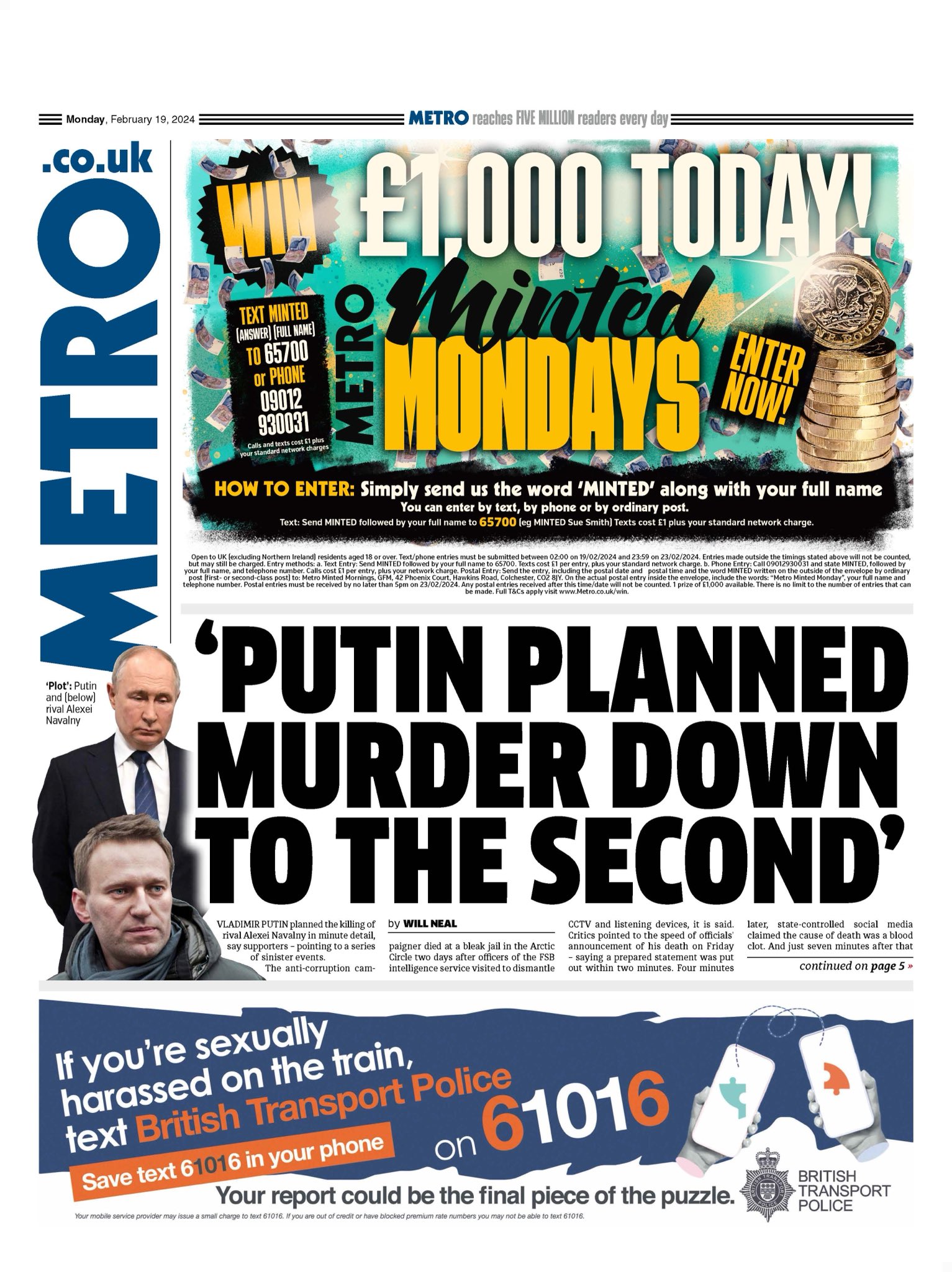 The Metro paper reports on Putin’s meticulous planning of activist Alexei Navalny’s death.