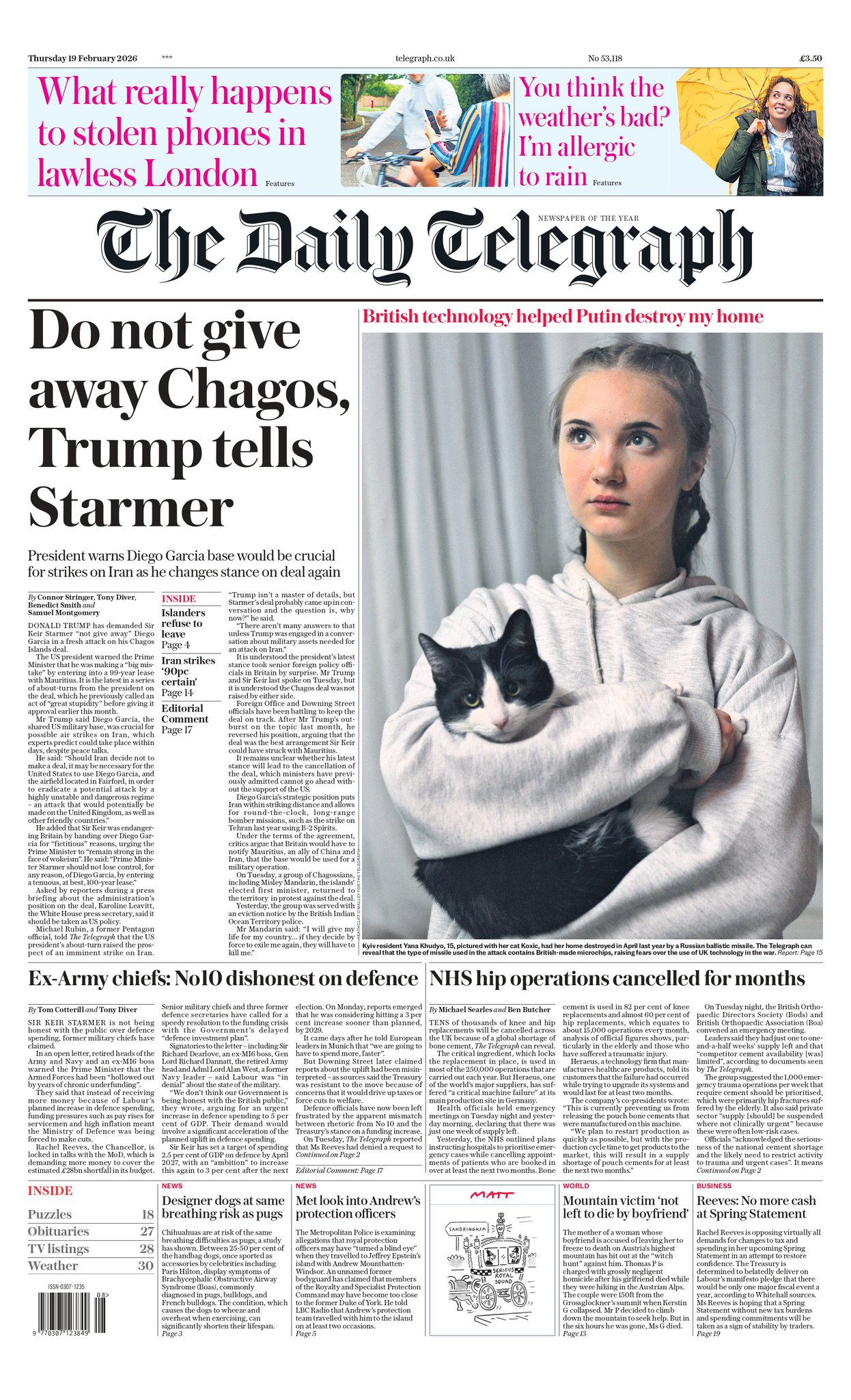 Donald Trump urged the PM not to proceed with a deal over the Chagos Islands, arguing the Diego Garcia base is crucial for UK–US security operations in the region. He warned a handover to Mauritius would weaken Western defence. Downing Street says no decision has been taken.