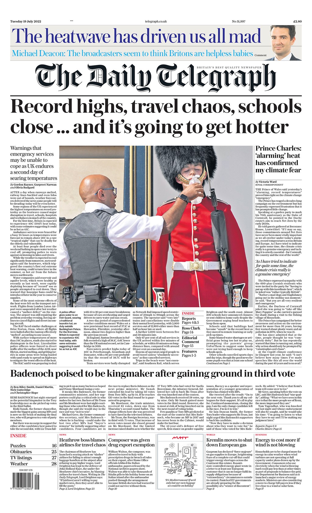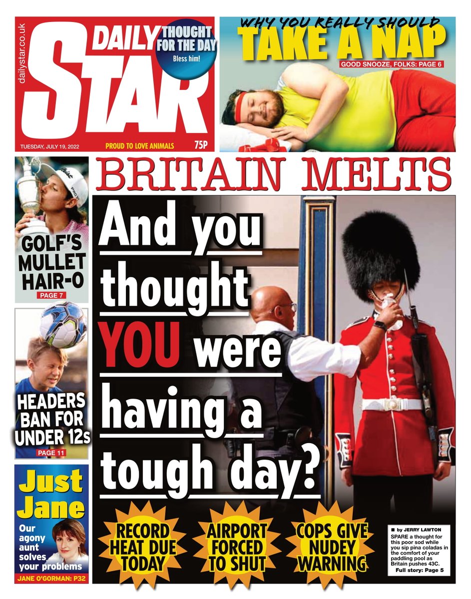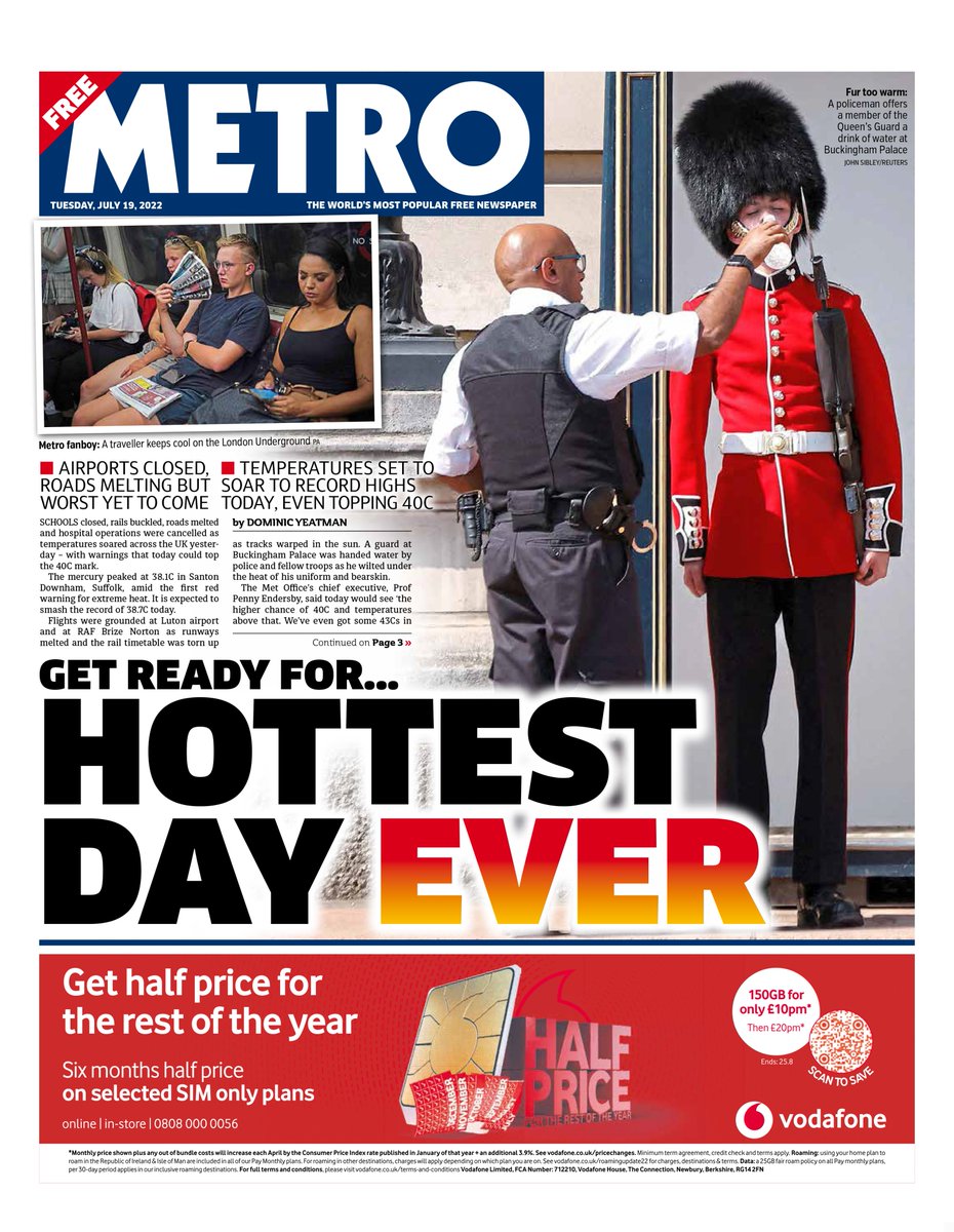 The Metro warns of England’s ‘hottest day ever’ and features an iconic image of a member of the Queen’s guard being given water to stay hydrated during a day of blistering temperatures.