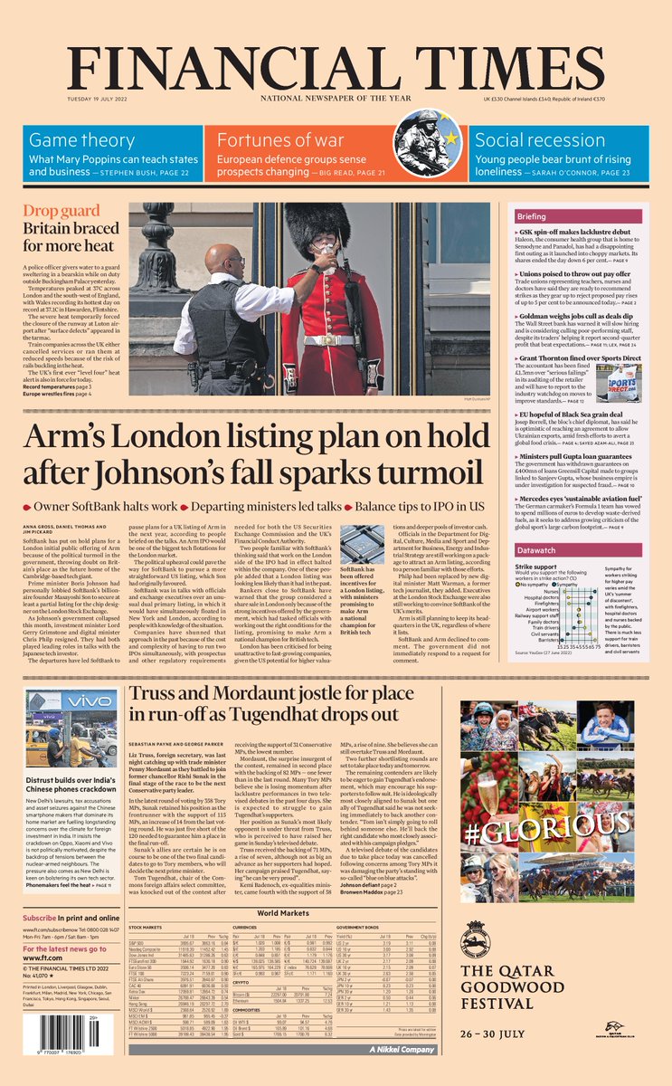FT reports that Boris Johnson’s resignation as Prime Minister put an end to Softbank’s plans for an IPO of Arm.