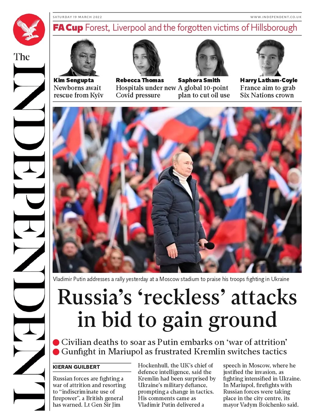 A British general has warned the Russian forces are fighting a war of attrition. The Independent quote Lieutenant General Sir Jim Hockenhull, who said the Kremlin was surprised by Ukraine’s military defiance, resulting in a change in tactics.