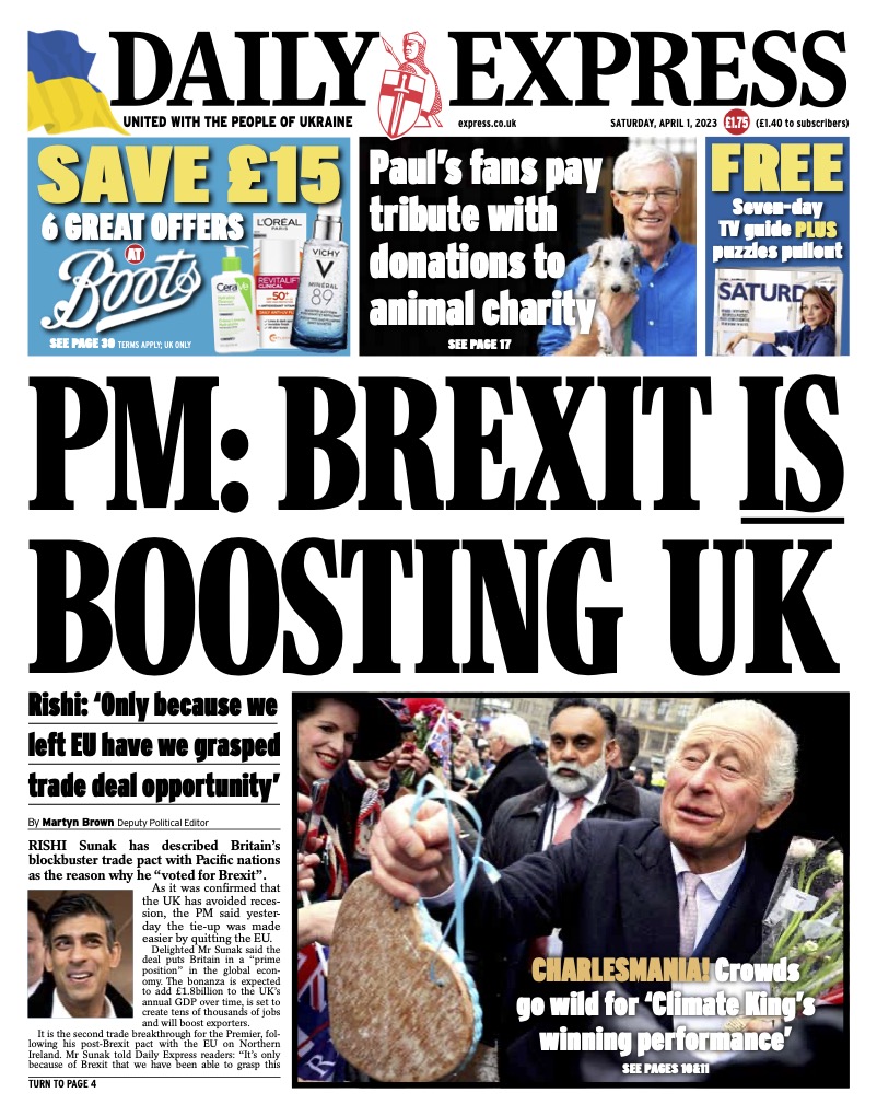 Rishi Sunak claims Brexit is boosting the UK economy in the Daily Express.