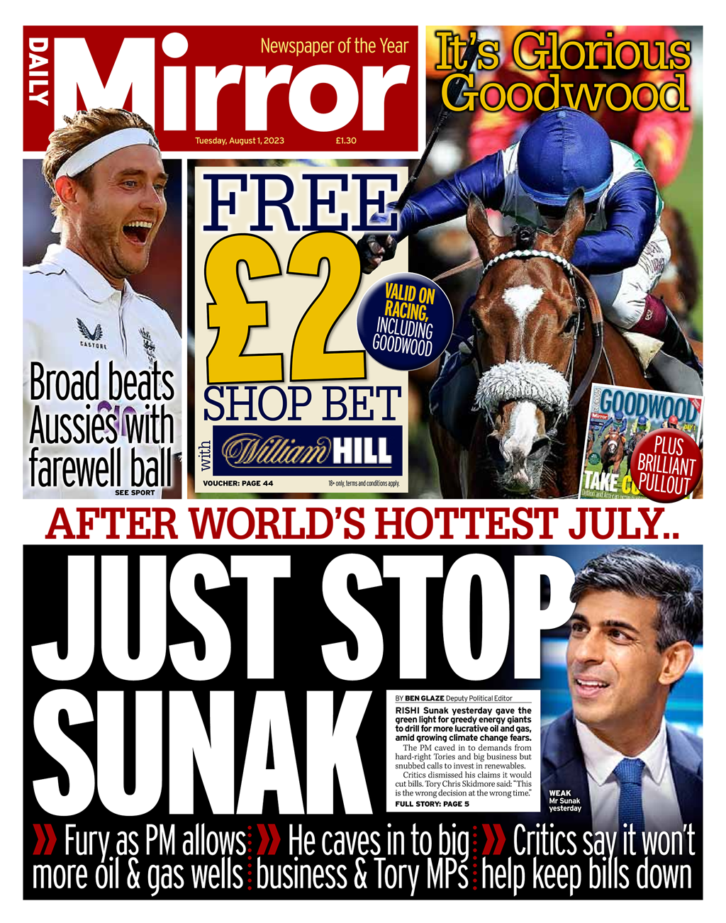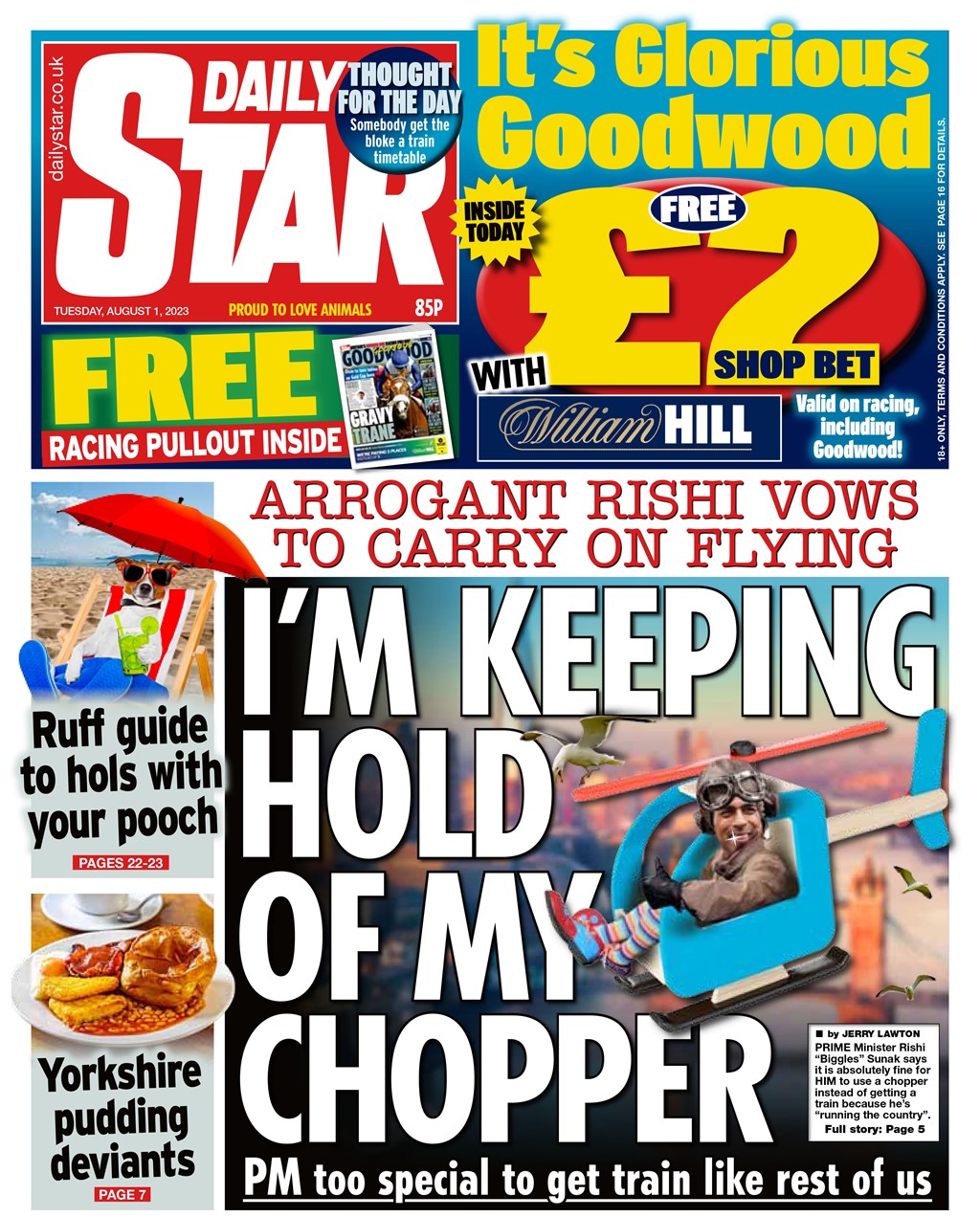 Rishi Sunak’s use of helicopters for short-distance travel attracts criticism in the Daily Star.