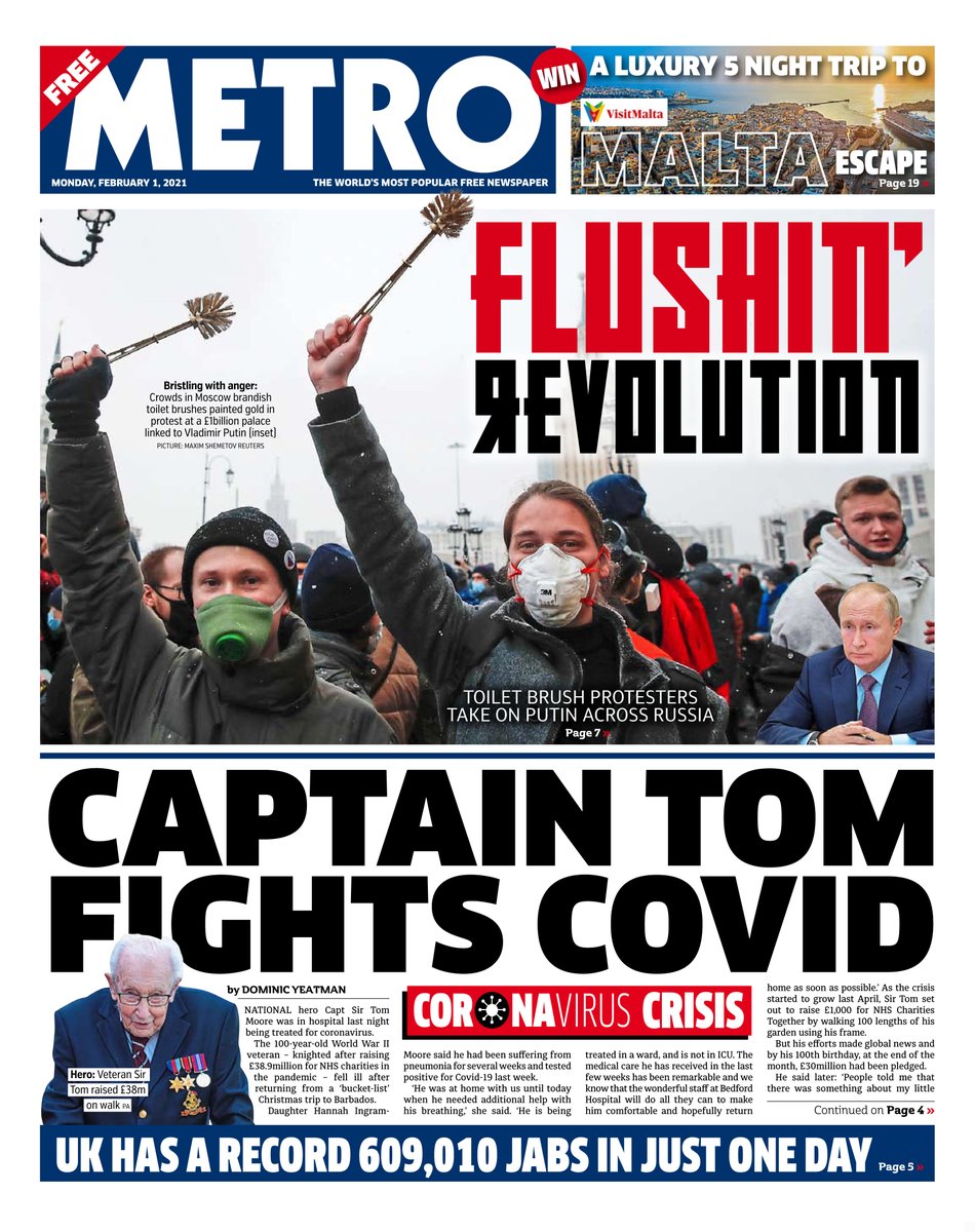 Metro leads with the news that Captain Sir Tom Moore is in hospital after being diagnosed with the coronavirus.