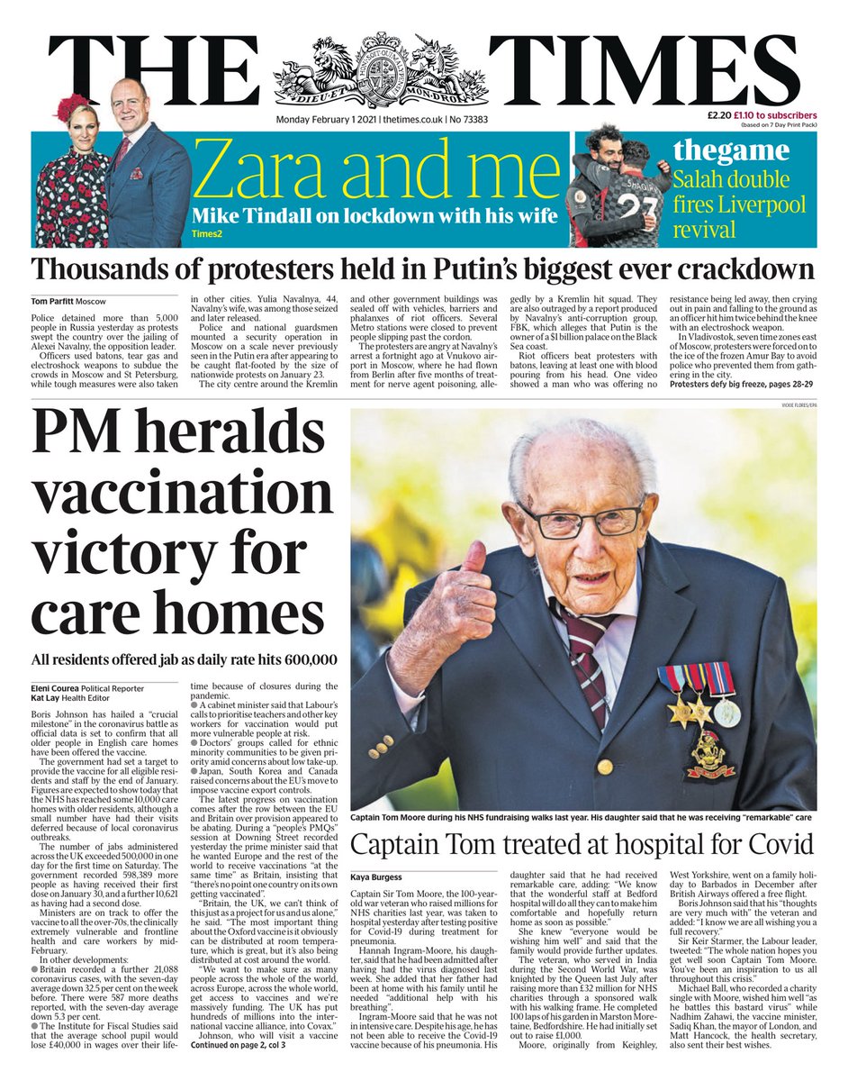 The Times leads with news of a “crucial milestone” in the fight against the coronavirus.