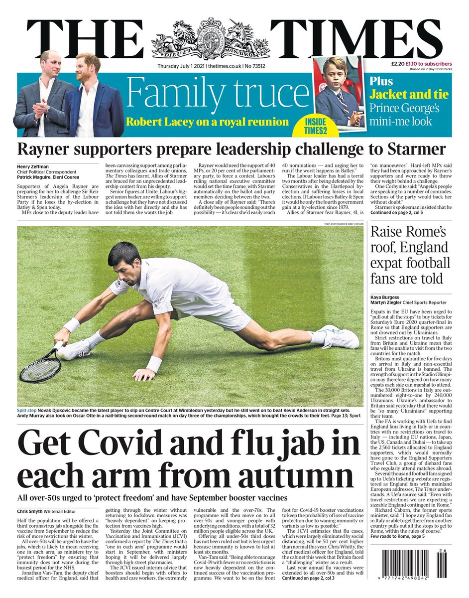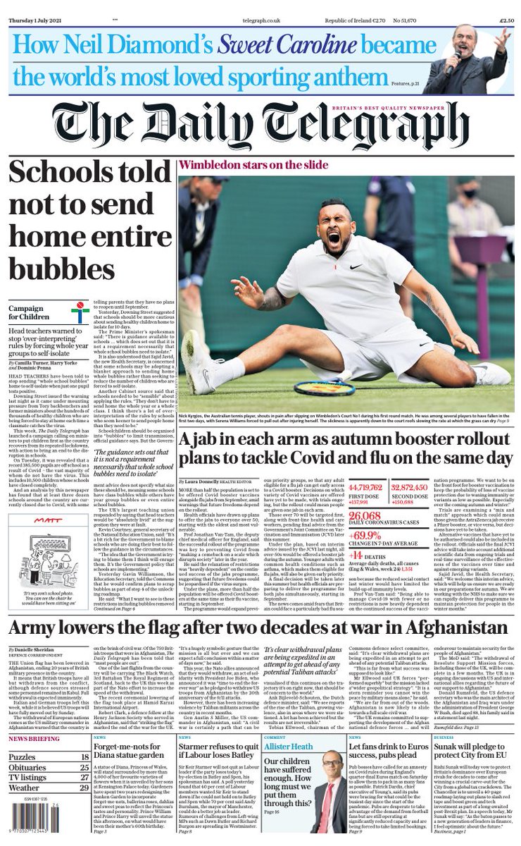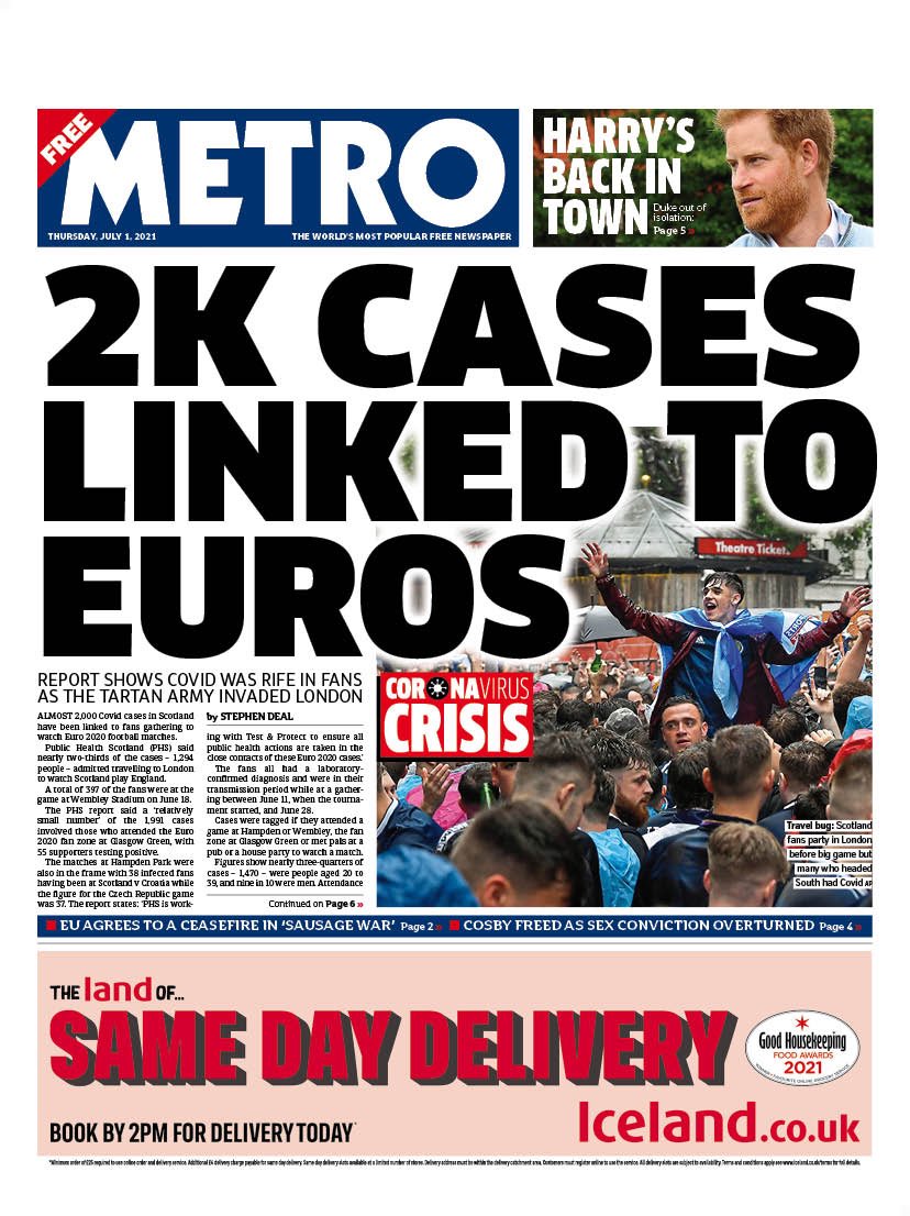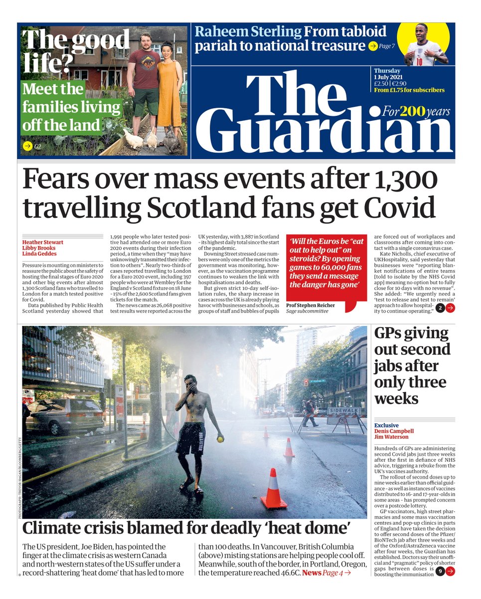 The Guardian says pressure is mounting on ministers to reassure the public about the safety of hosting the final stages of Euro 2020 and other big events after almost 1,300 Scotland fans who travelled to London for a match tested positive for COVID-19.