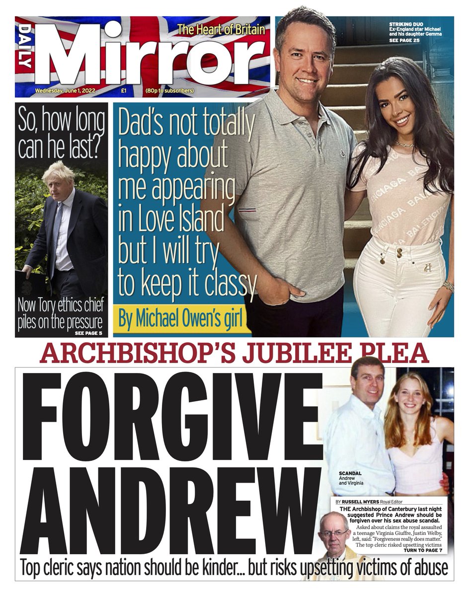 The Daily Mirror starts with the Archbishop of Canterbury’s suggestion that Prince Andrew should be forgiven for his sex abuse scandal.