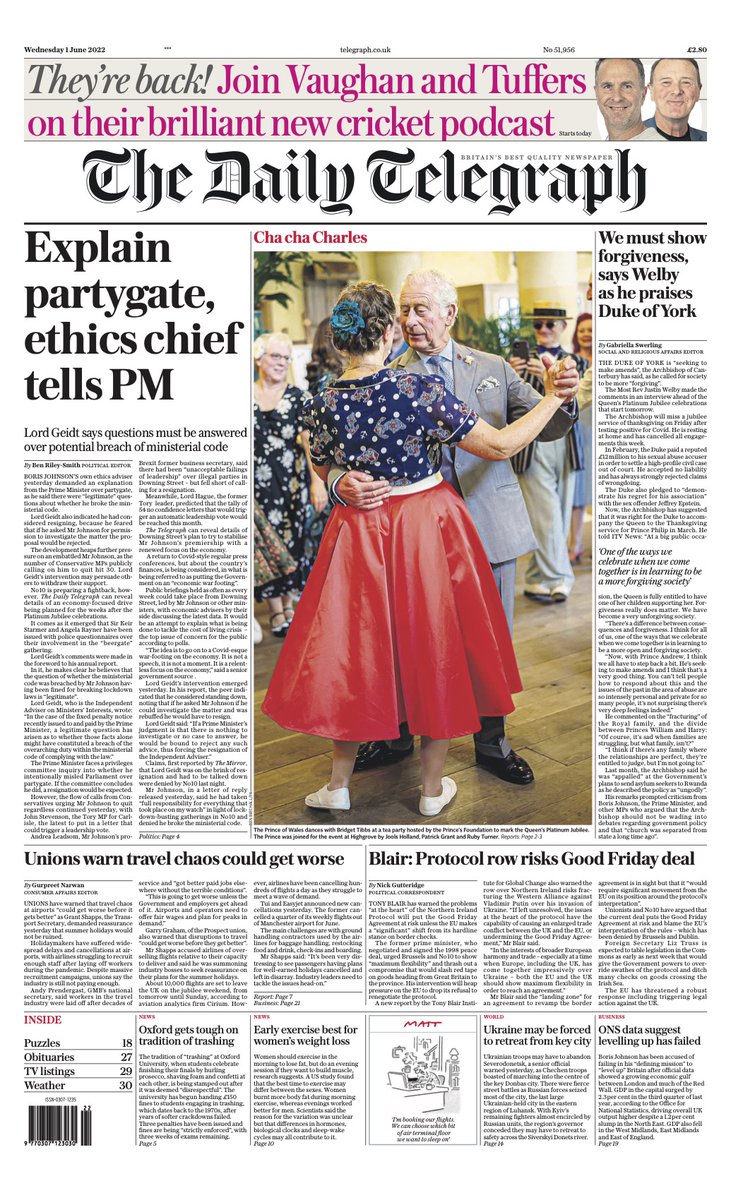 Boris Johnson’s ethics adviser said there were “legitimate” questions as to whether the prime minister had broken the ministerial code, according to the Daily Telegraph.