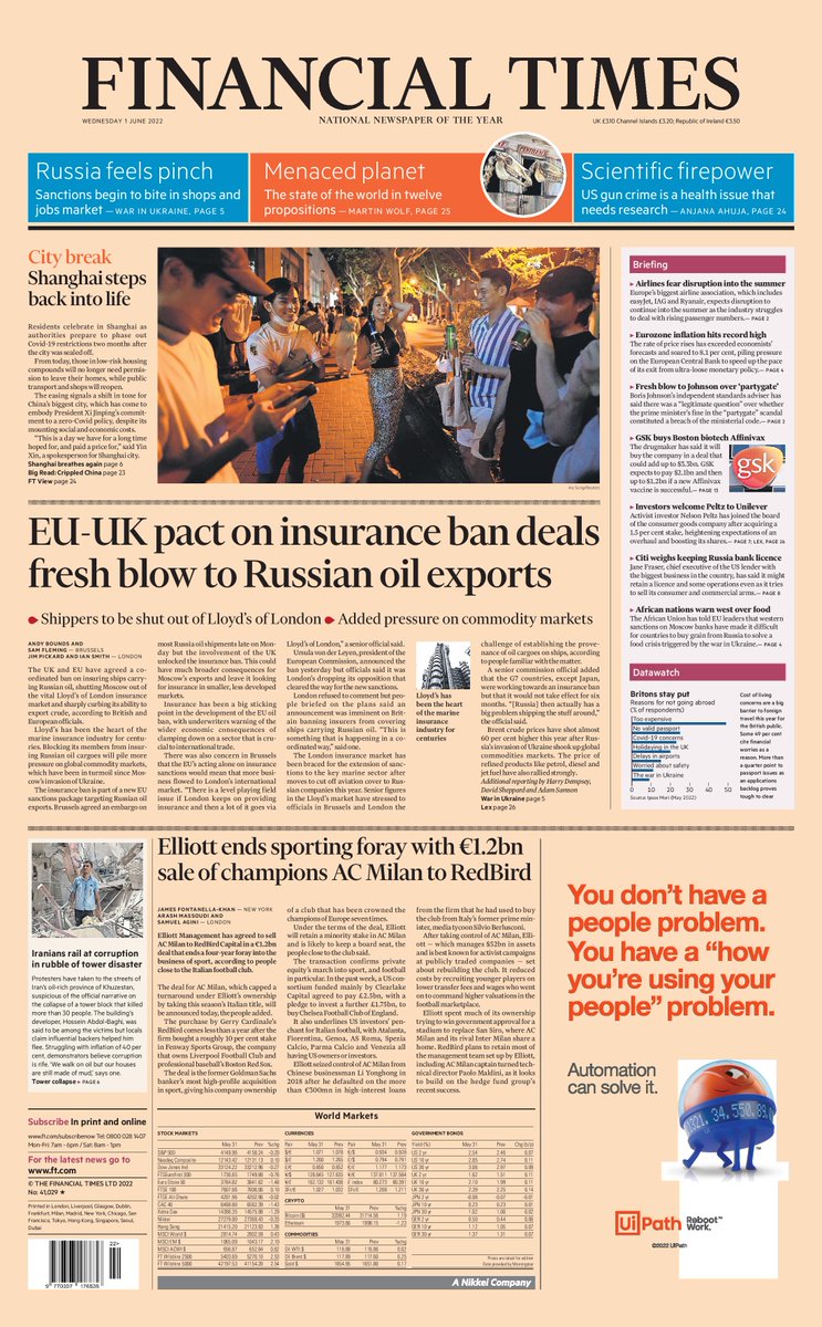 Financial Times reports that the UK and EU have agreed to a coordinated ban on insuring ships carrying Russian oil, thereby cutting Moscow off from the Lloyd’s of London insurance market and limiting its ability to export crude.