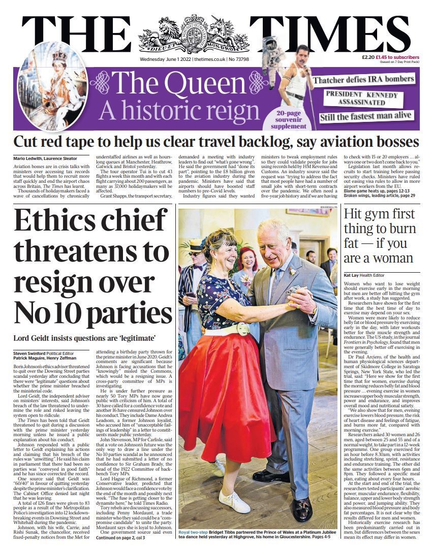 According to The Times, Boris Johnson’s ethics adviser has threatened to resign after concluding that there were “legitimate” questions about whether the prime minister broke the ministerial code.