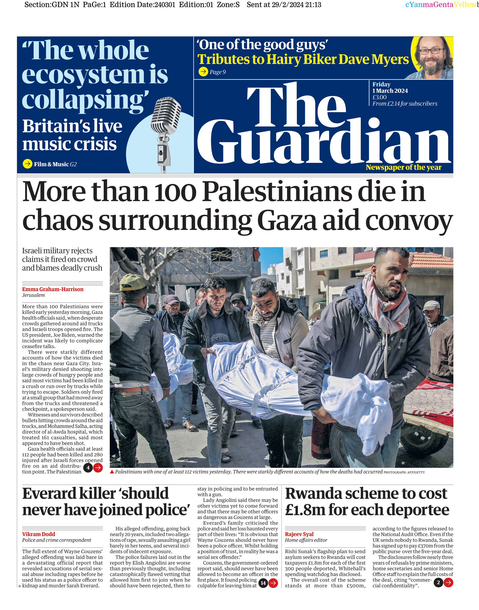 Over 100 Palestinians were killed amid chaos at Gaza City aid trucks, reports the Guardian.